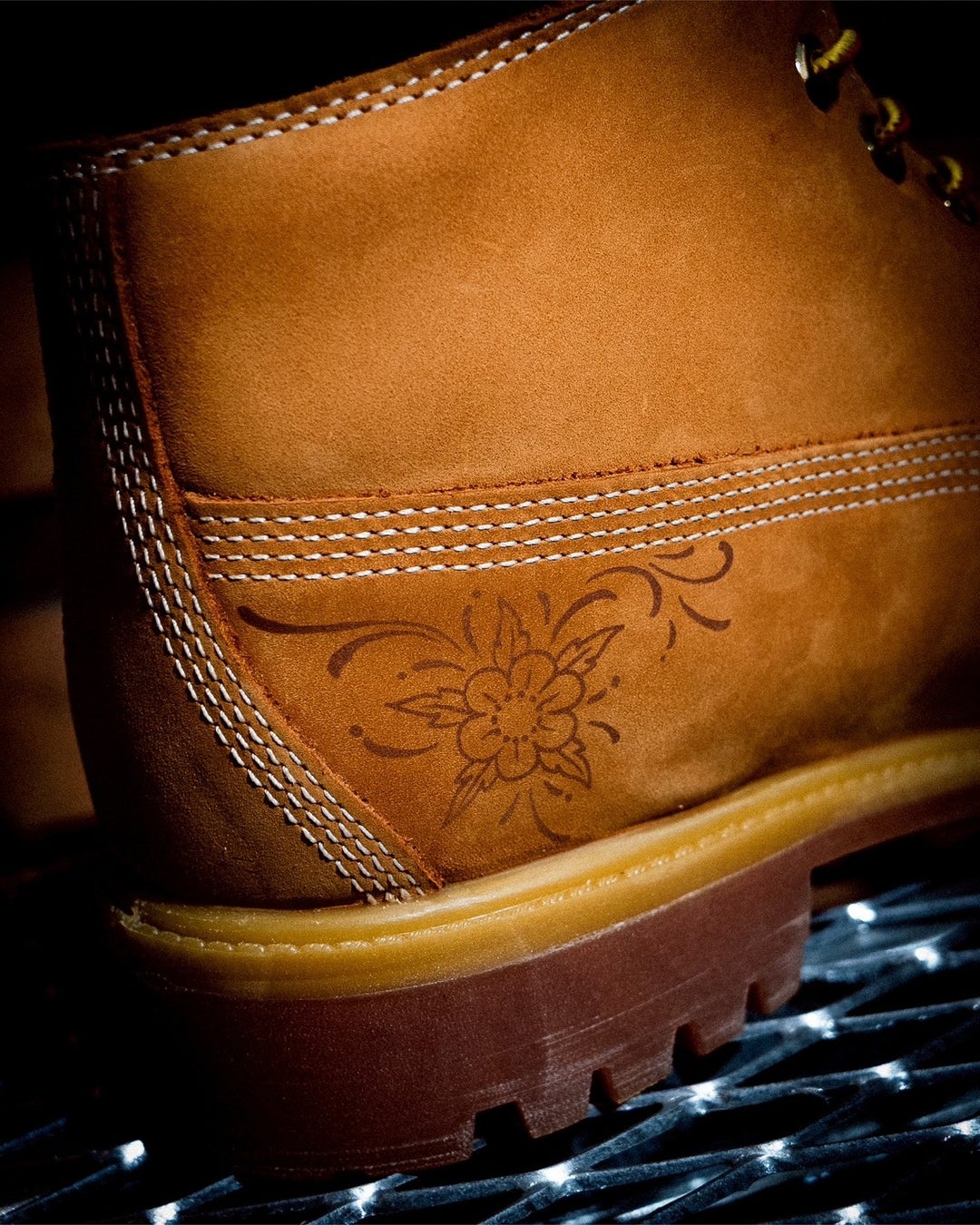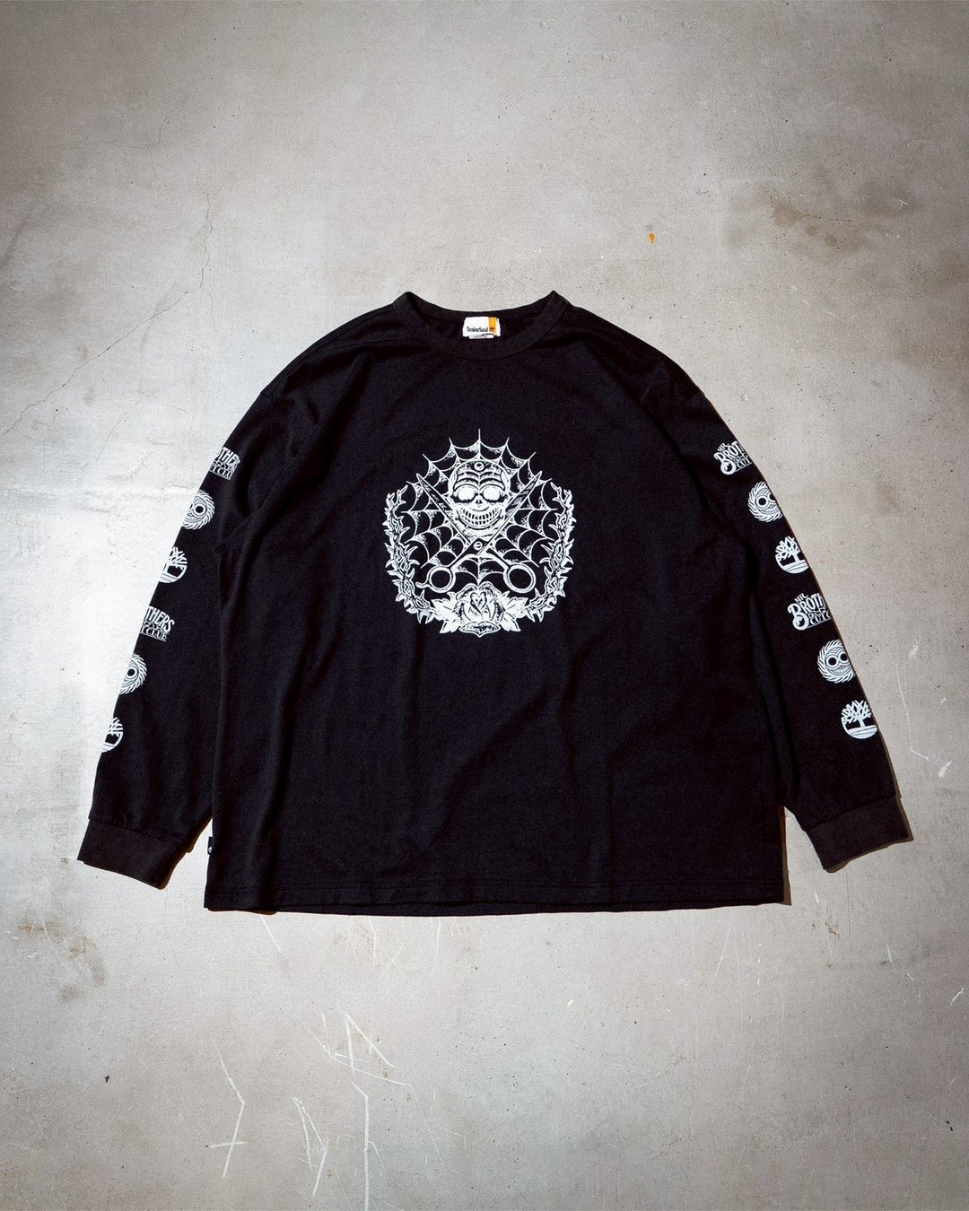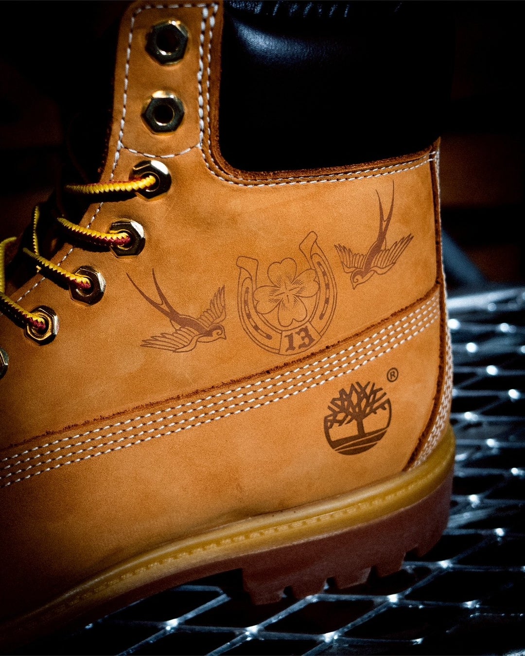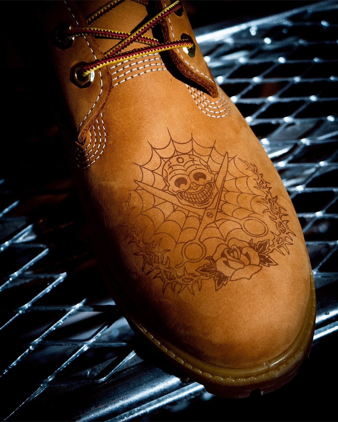 そんな『ミスター・ブラザーズ・カットクラブ』との初コラボアイテムは、ティンバーランドを象徴するアイコンブーツ“6インチ プレミアム ウォータープルーフ ブーツ(通称:オリジナル イエローブーツ)”と共に、2型の半袖Tシャツと2型のロングスリーブTシャツをラインナップいたしました。“オリジナル イエローブーツ”は、アイコニックなシルエットや素材はそのままに、日本発のシルバーアクセサリーブランドであるマジカル デザイン(MAGICAL DESIGN)を手掛ける内山英雄氏がデザインした、ドクロやツバメなどのオリジナルモチーフをアッパーの随所に刻印しています。