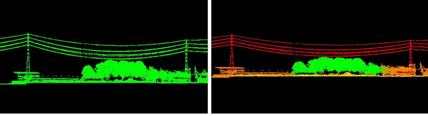 朝日航洋は、空間情報事業の社会インフラ点検分野において、ヘリコプターや計測車両を使用し、送電線などの電力設備を撮影・計測し解析を行っています。可視光のカメラだけではなくレーザ計測を行うことで、設備と植生の離隔や設置状況の異常の有無を立体的に確認しています。取得した3D点群データはあらゆる対象物が点の集まりで表されており、どの点がどの対象物を示しているのかは、これまでは全て人が目視で確認し、手作業で仕分け(フィルタリング作業)をしていました。その量は年間約5,000km、約1,700人日もの作業工数が発生します。膨大な作業負荷に加えて、目視によるフィルタリング作業では、作業者による判定のバラつきが生じることが課題でした。
