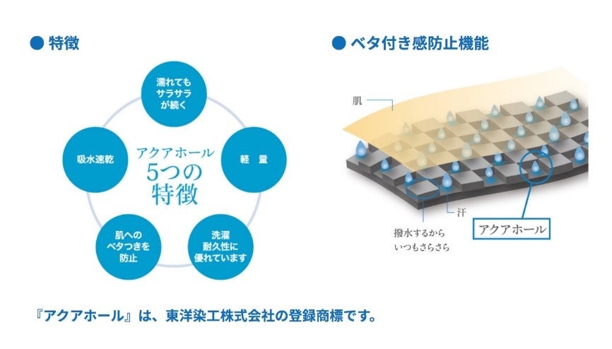 ・凹凸生地の凸部先端のみに撥水加工を行い、ベースの生地には吸水加工を施してあるため、汗はアクアホール(凹部)に吸収されて肌へのベタ付き感を防ぎます。
