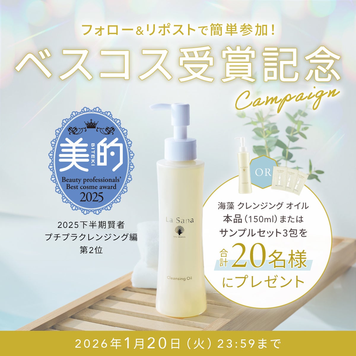 ヘアトリートメント カウンセリング 国内売上No.1(※1)の海藻コスメブランド「ラサーナ」を展開する株式会社ヤマサキ(本社 : 広島市、代表取締役 兼 CEO : 土肥 光)は、2025年9月1日(月)に発売したスキンケアラインのうち『ラサーナ 海藻 クレンジング オイル』(150ml・140ml)が、ラサーナのスキンケアライン約40年の歴史の中で初のベストコスメを受賞したことをお知らせします。また、これを記念したプレゼントキャンペーンをラサーナ公式Xにて2026年1月6日(火)より実施いたします。