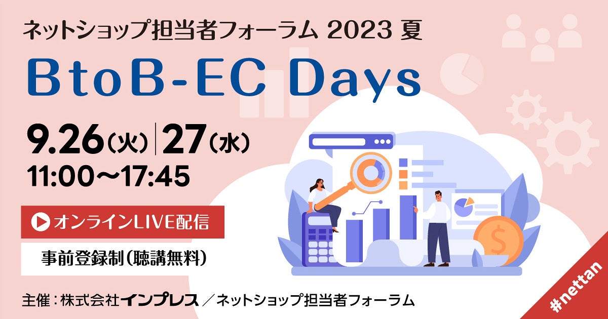BtoBの受発注業務をEC化するクラウドサービス「Bカート」は、2023年9月26日(火)に開催される株式会社インプレス主催のオンラインセミナーイベント「ネットショップ担当者フォーラム 2023 夏 ~BtoB-EC Days~」に登壇いたします。