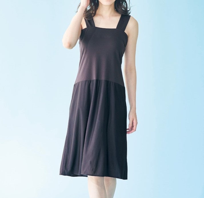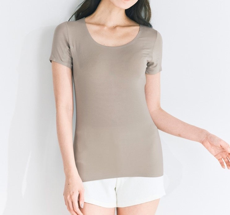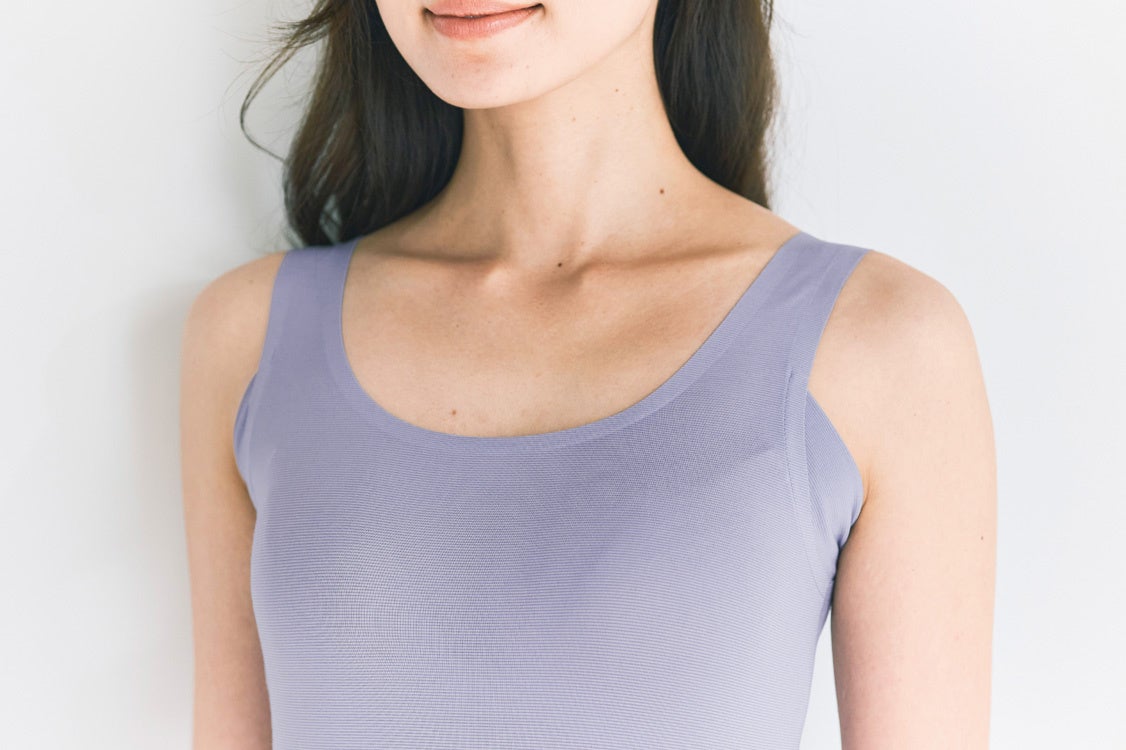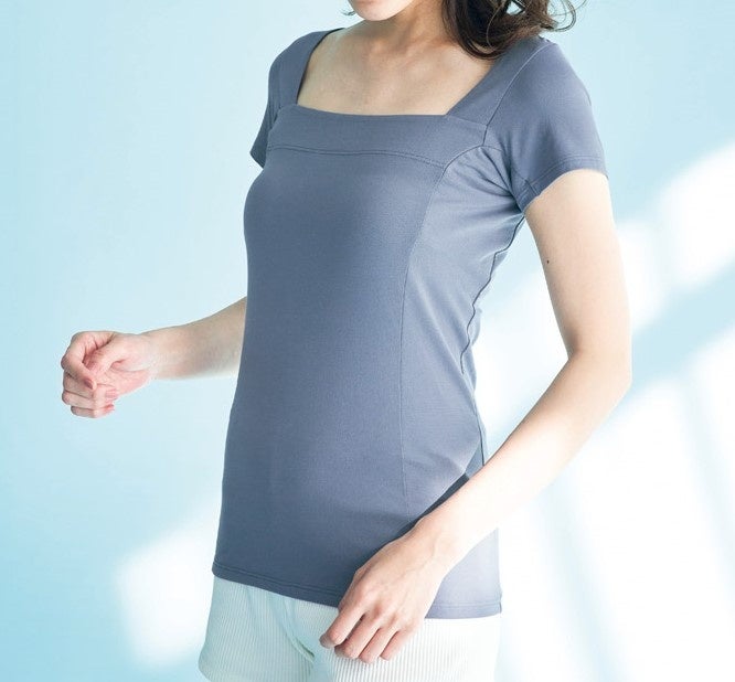 幅広のストラップでブラジャーの紐をしっかり隠し、スクエアの襟ぐりや脇高設計で、前かがみになった時や腕を上げた時の「チラ見え」を防ぐデザインとなっています。生地はストレッチ性に優れた吸水速乾機能がある綿混素材を使用しているのでサラッとした着心地です。ワキ部分は防水シートを2枚の生地で挟んだ三層構造の汗取りパッドを内蔵している(※2)ので、汗ジミを気にせずオシャレを楽しむことができます。