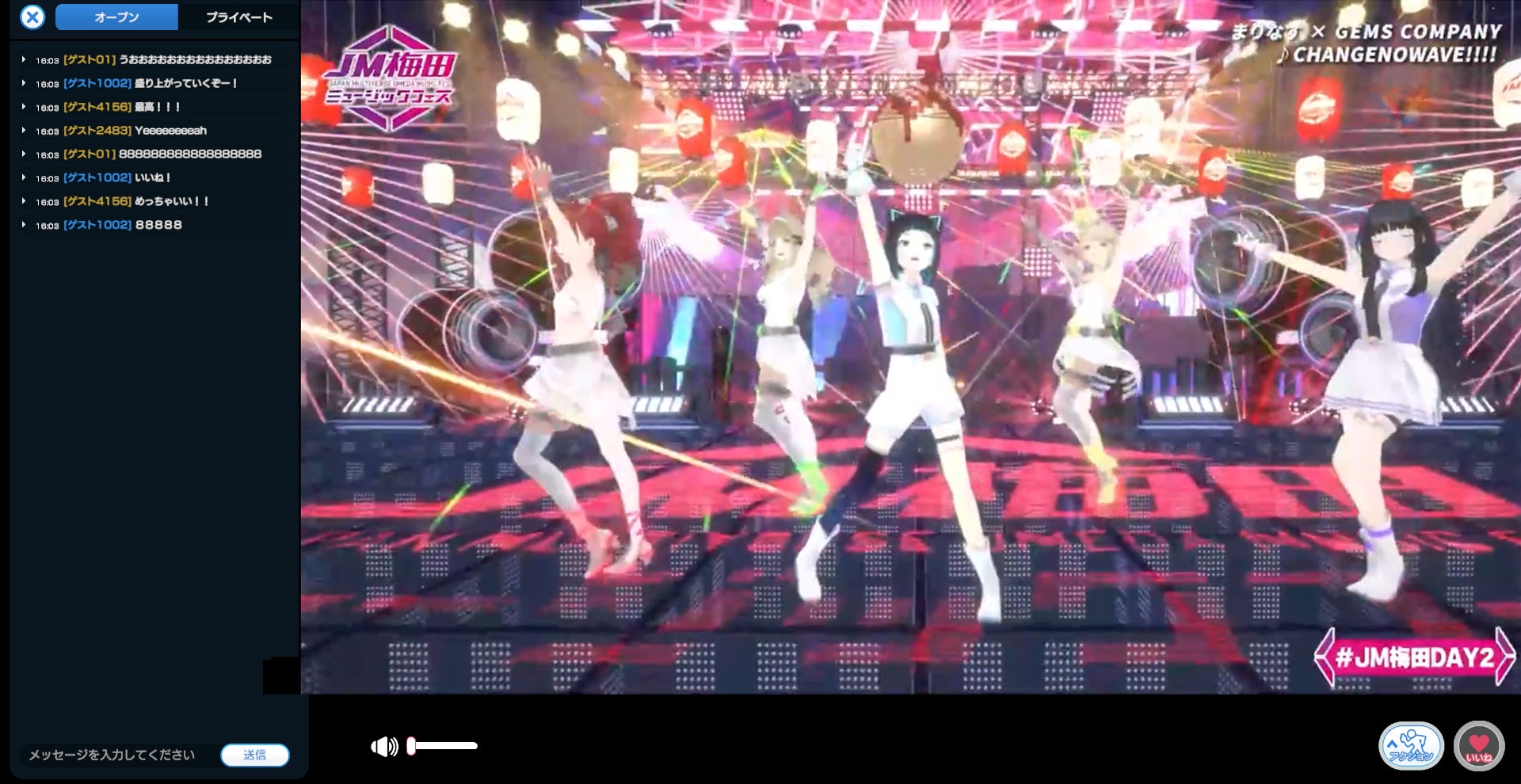 ライブをフルスクリーンで楽しみながら、テキストチャットやエモート機能を使用することが可能です。