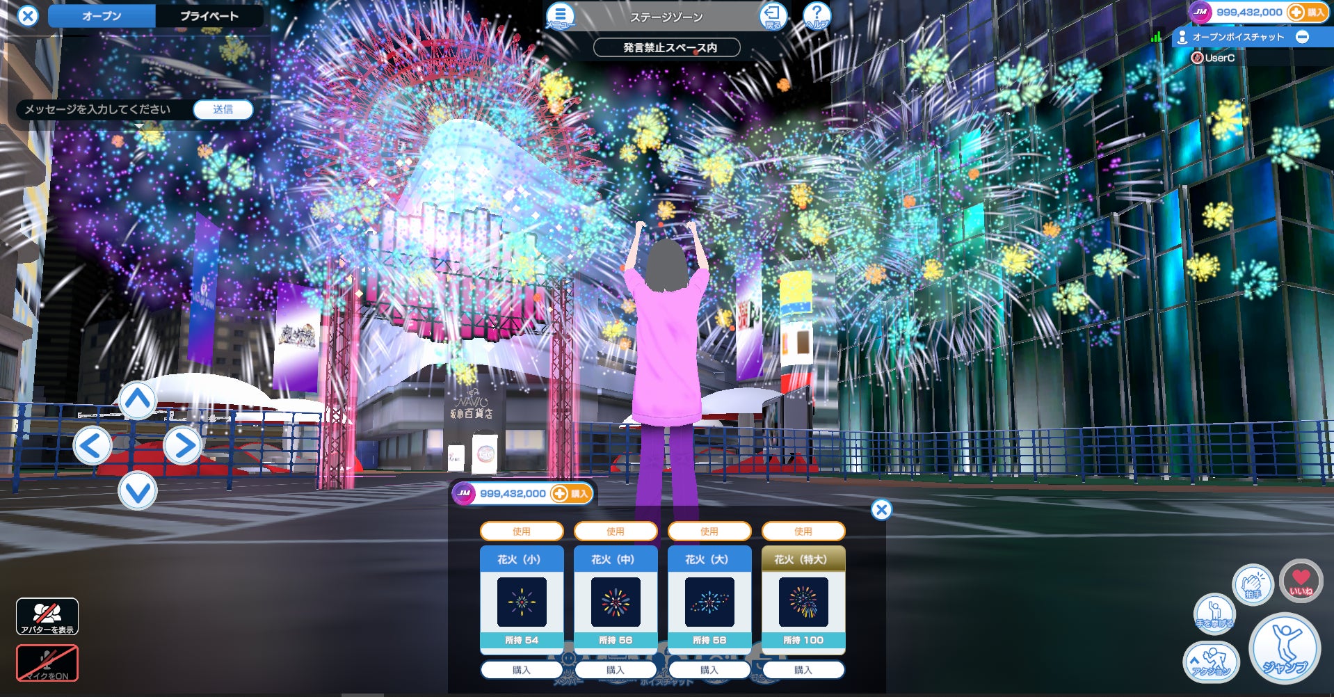 [テーブル, 座る, ストリート, カラフル が含まれている画像 自動的に生成された説明] ライブ中の演出アイテムとして、「花火」を打ち上げることが可能です。全4種類。