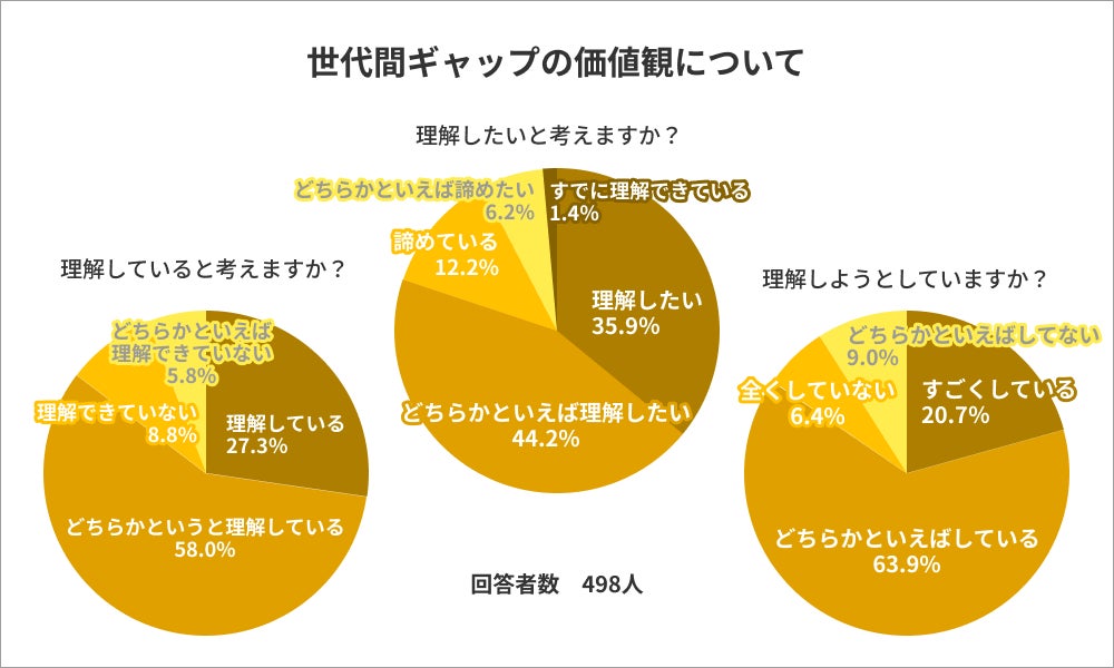 世代間ギャップで感じる価値観を”理解している”かについて聞くと、「理解している」27.3%と「どちらかといえば理解している」58.0%を合算した85.3%が理解している派の回答をしました。また”理解したい”と考えるかについては「理解したい」35.9%と「どちらかといえば理解したい」44.2%を合算した80.1%が理解したいと考える派の回答をしました。さらに”理解しようとしている”かについて聞くと「すごくしている」20.7%と「どちらかといえばしている」63.9%を合算した84.6%が理解しようとしている派の回答をしました。