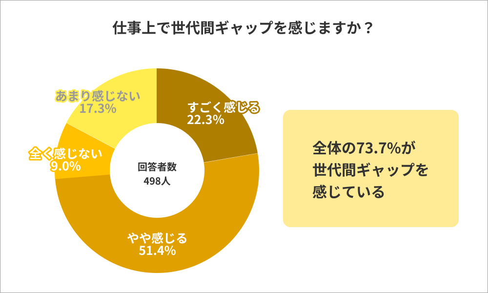 | 【TOPICS】 ・全体の73.7%が「仕事上で世代間ギャップを感じる」と回答 ・全体の95.9%が仕事に対する考え方にギャップを感じている ・Z世代は69.7%がバブル世代にギャップを感じている ・バブル世代がZ世代にギャップ感じる回答は34.6% ・全体の85.3%が別世代の価値観を理解していると回答 |