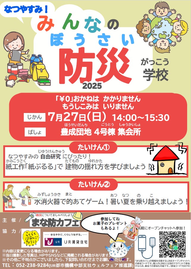 【概要】団地及び地域の子どもを対象に、紙模型の防災キットの作成や水消火器を使用したストラックアウトを実施予定。夏休みの自由研究ネタにも!