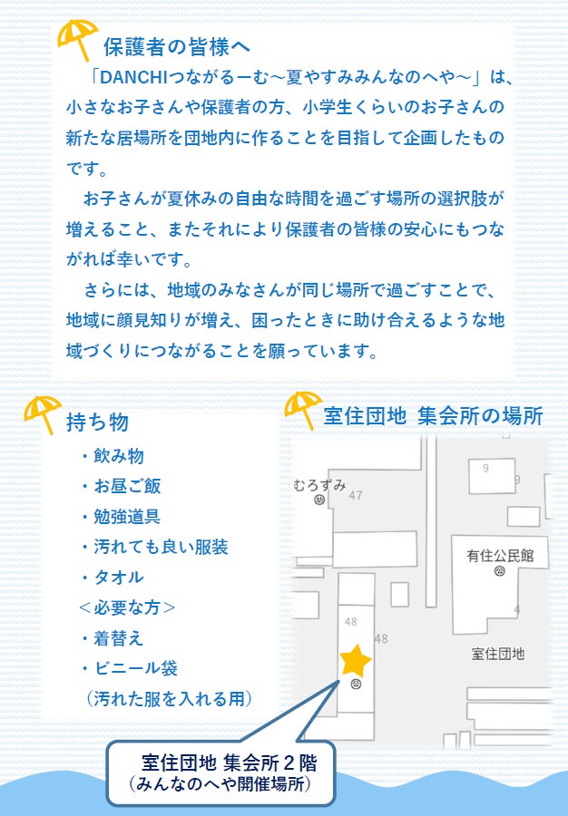 【概要】夏休みの一定期間、クールシェアスポットとして、集会所を開放します! 最終日は、子どもも大人も楽しめる、一夜限りのナイトクールイベントを開催!