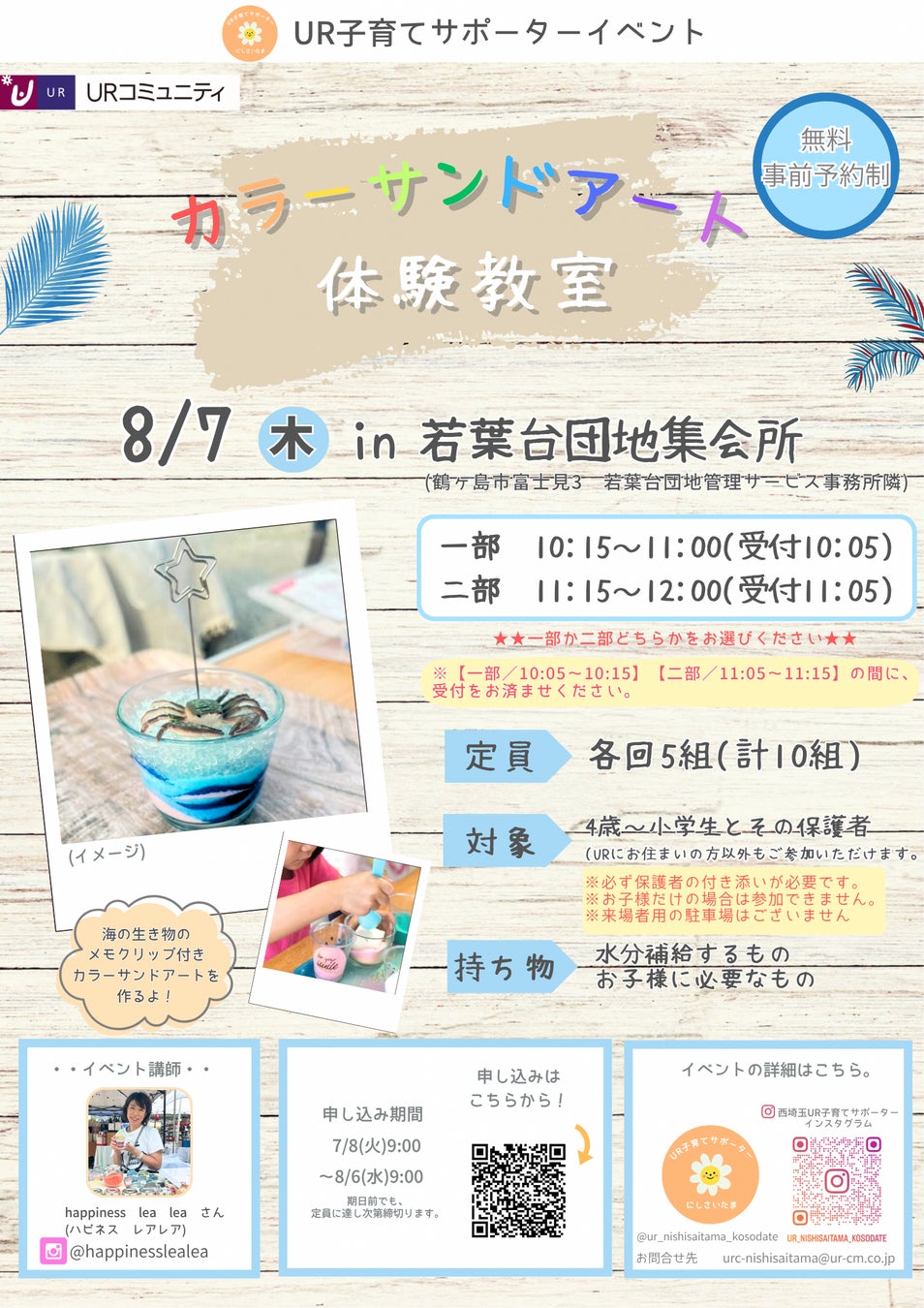 【概要】4歳~小学生とその保護者を対象にした海の生き物クリップ付きのカラーサンドアートの体験教室。(事前申込制)
