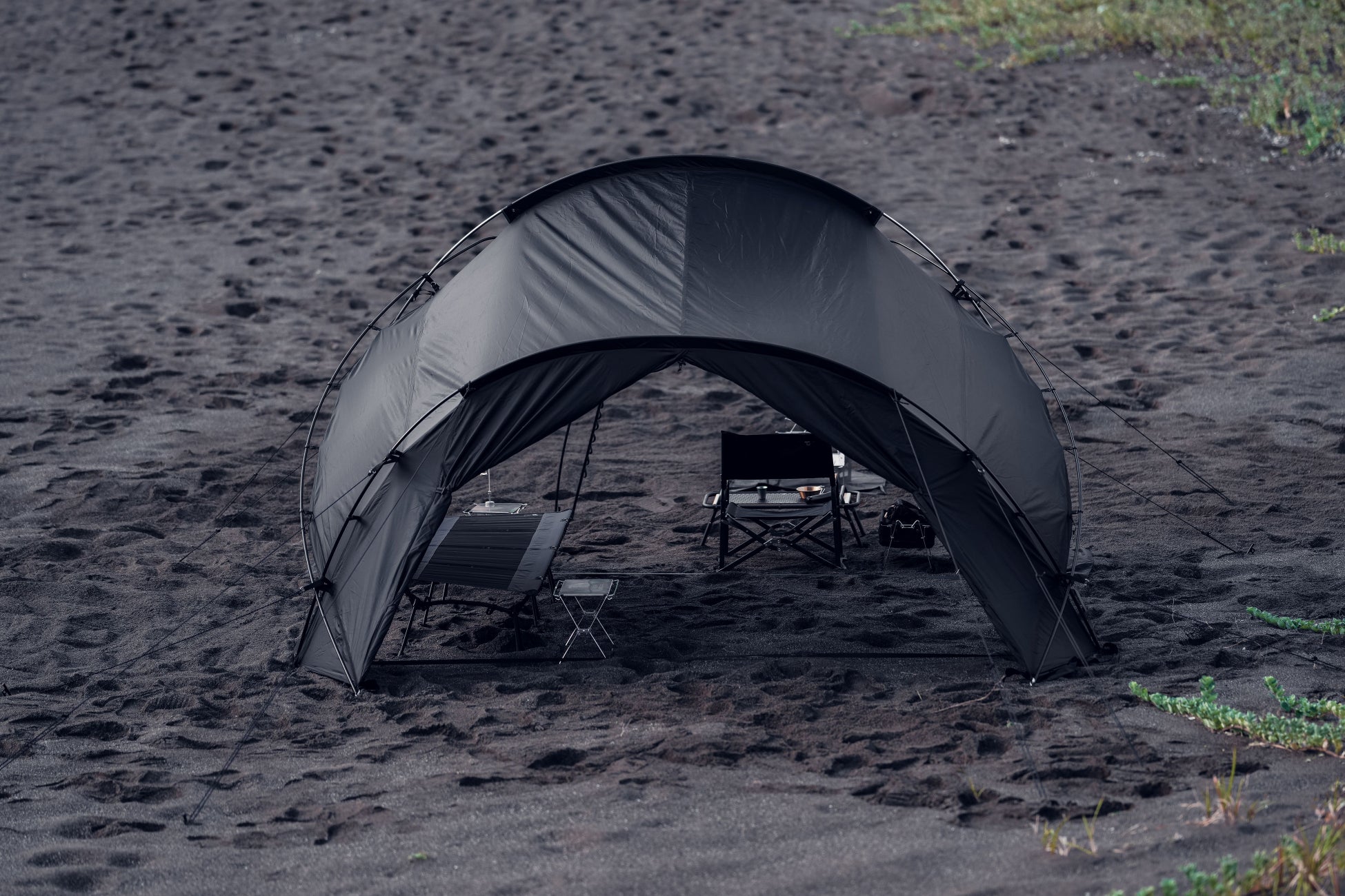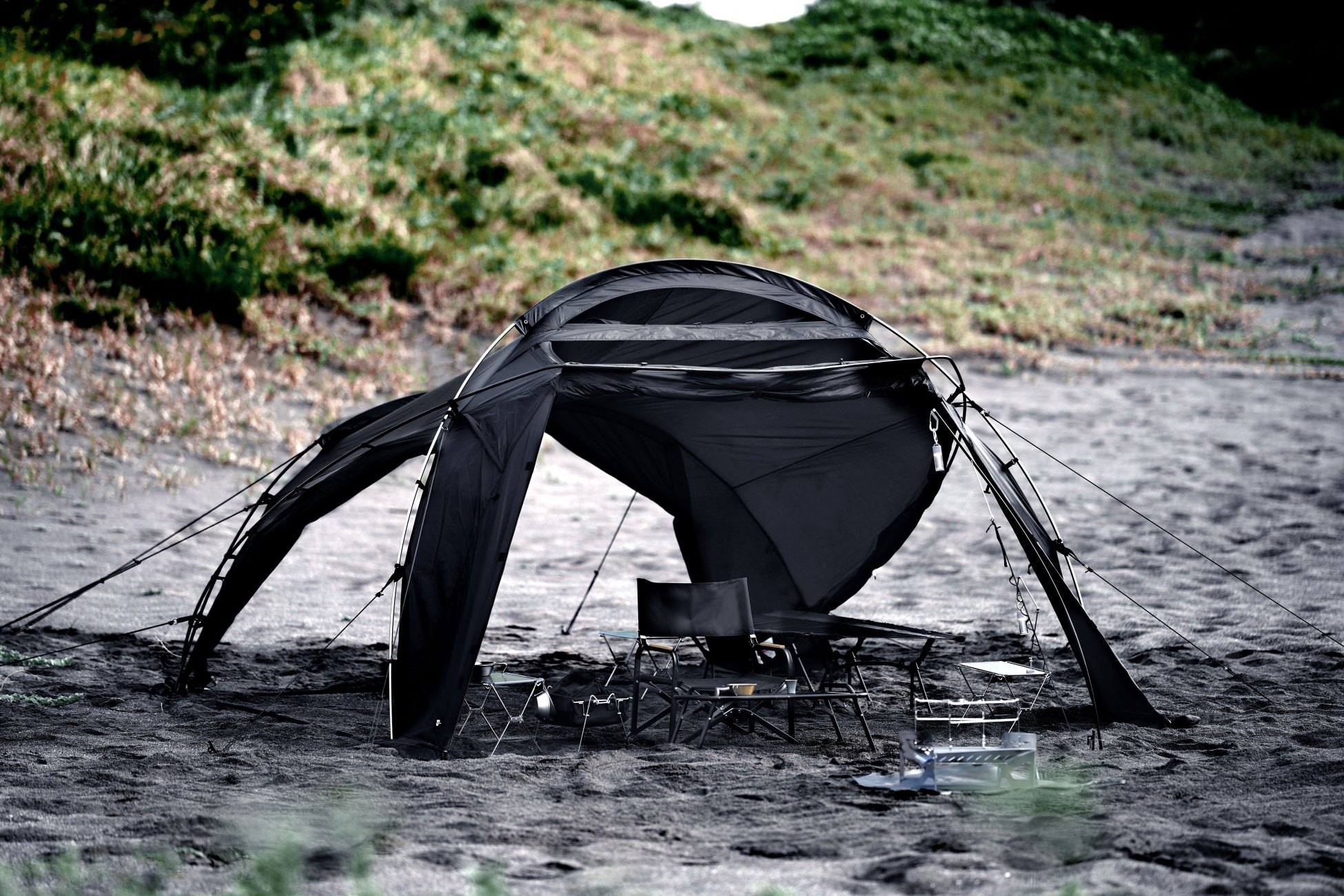 持ち運びやすさ、設営のしやすさ、そして居住性にこだわり抜いた「テンビ シェルター」に、待望のブラックが新登場。これまでのカーキやグレーに加え、新たにラインナップしたブラックは、よりスタイリッシュで洗練されたキャンプ空間を演出します。