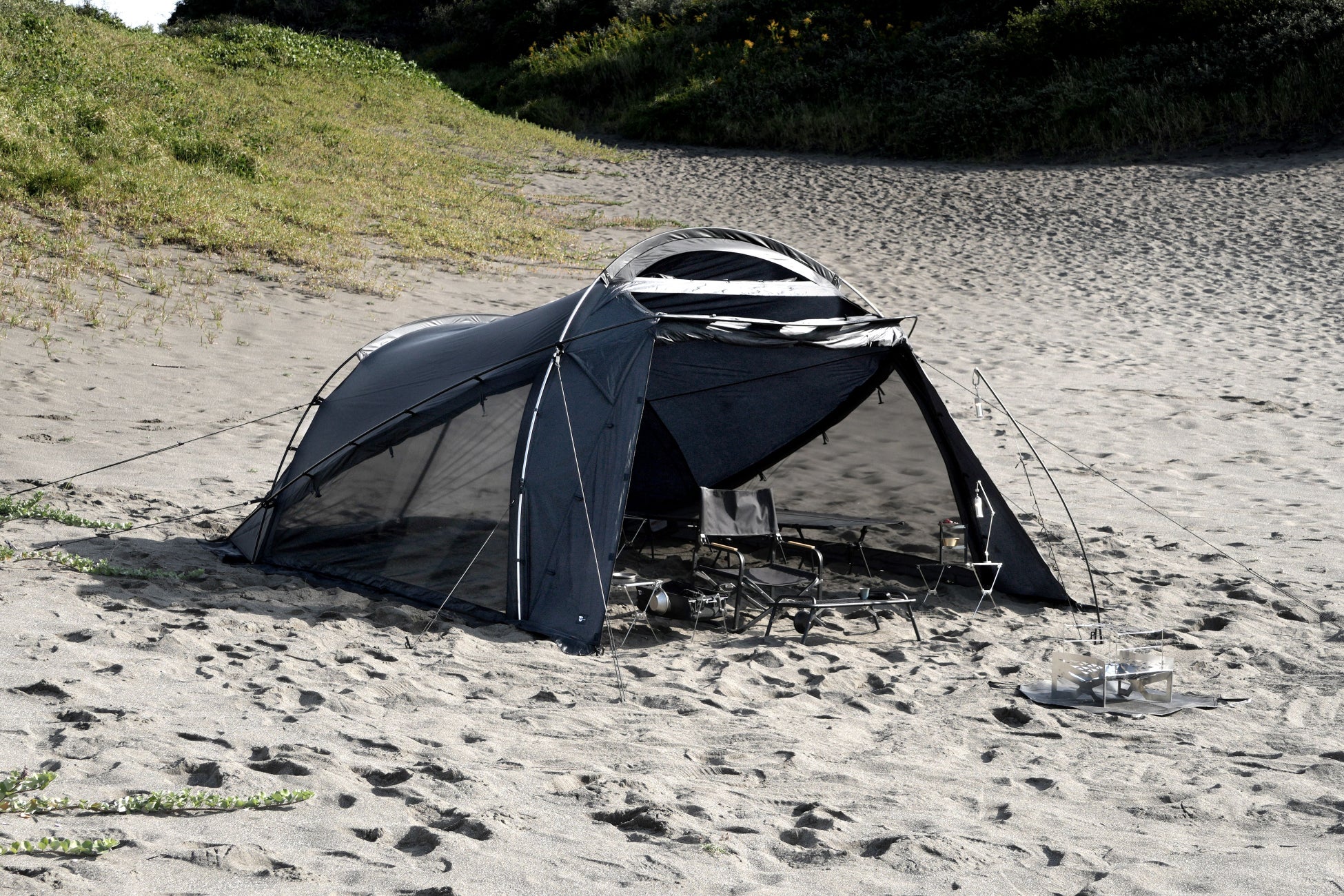ブラックの「テンビシェルター」は、キャンプスタイルの主役として引き立て、無骨でかっこいい空間を作り上げます。シンプルでありながら機能性に富んだデザインが、アウトドアでの新たな楽しみ方を提案します。
