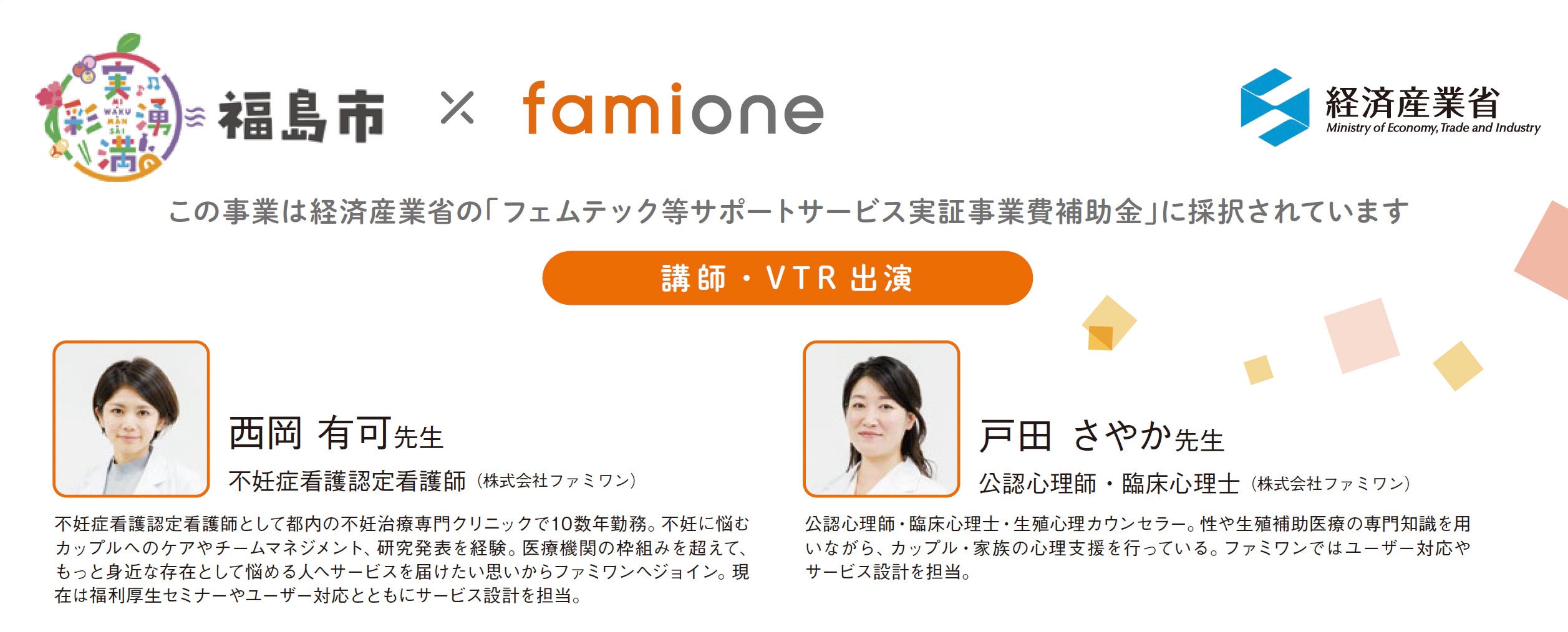 「子どもを願うすべての人によりそい 幸せな人生を歩める社会をつくる」をビジョンに掲げ、LINEを活用した妊活コンシェルジュサービス「famione(ファミワン)」 https://lp.famione.com/ を提供する株式会社ファミワン(本社:東京都渋谷区、代表取締役:石川勇介、以下当社)は、経済産業省 令和3年度「フェムテック等サポートサービス実証事業費補助金」における補助事業者に採択された取り組みとして、福島県福島市と連携して「未来の自分のためにできること ー生理・妊活・パートナーのことー」を2月19日に開催します。