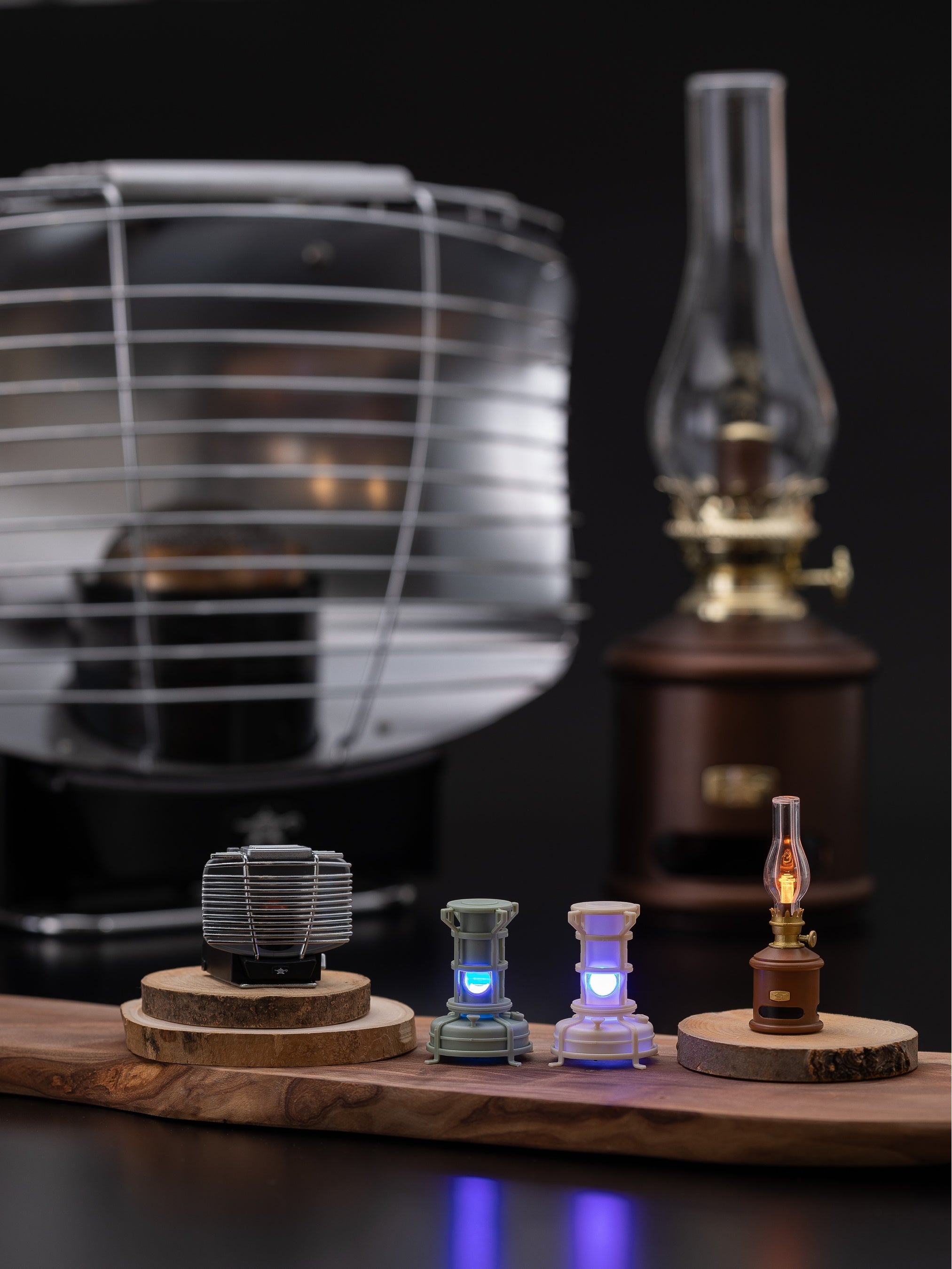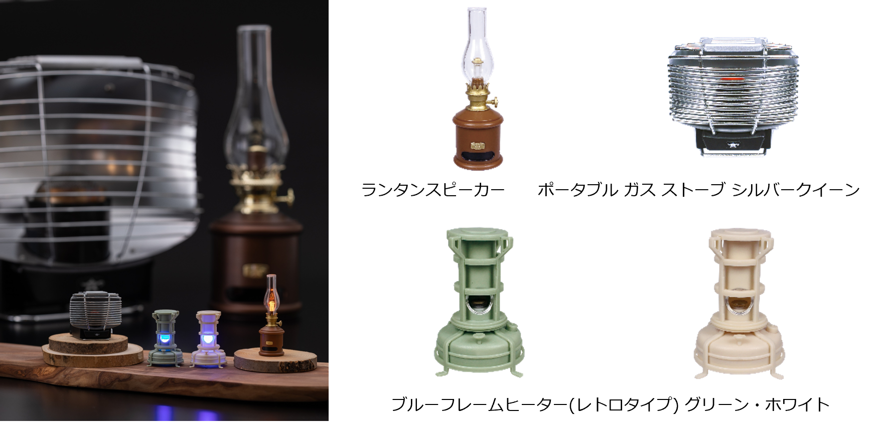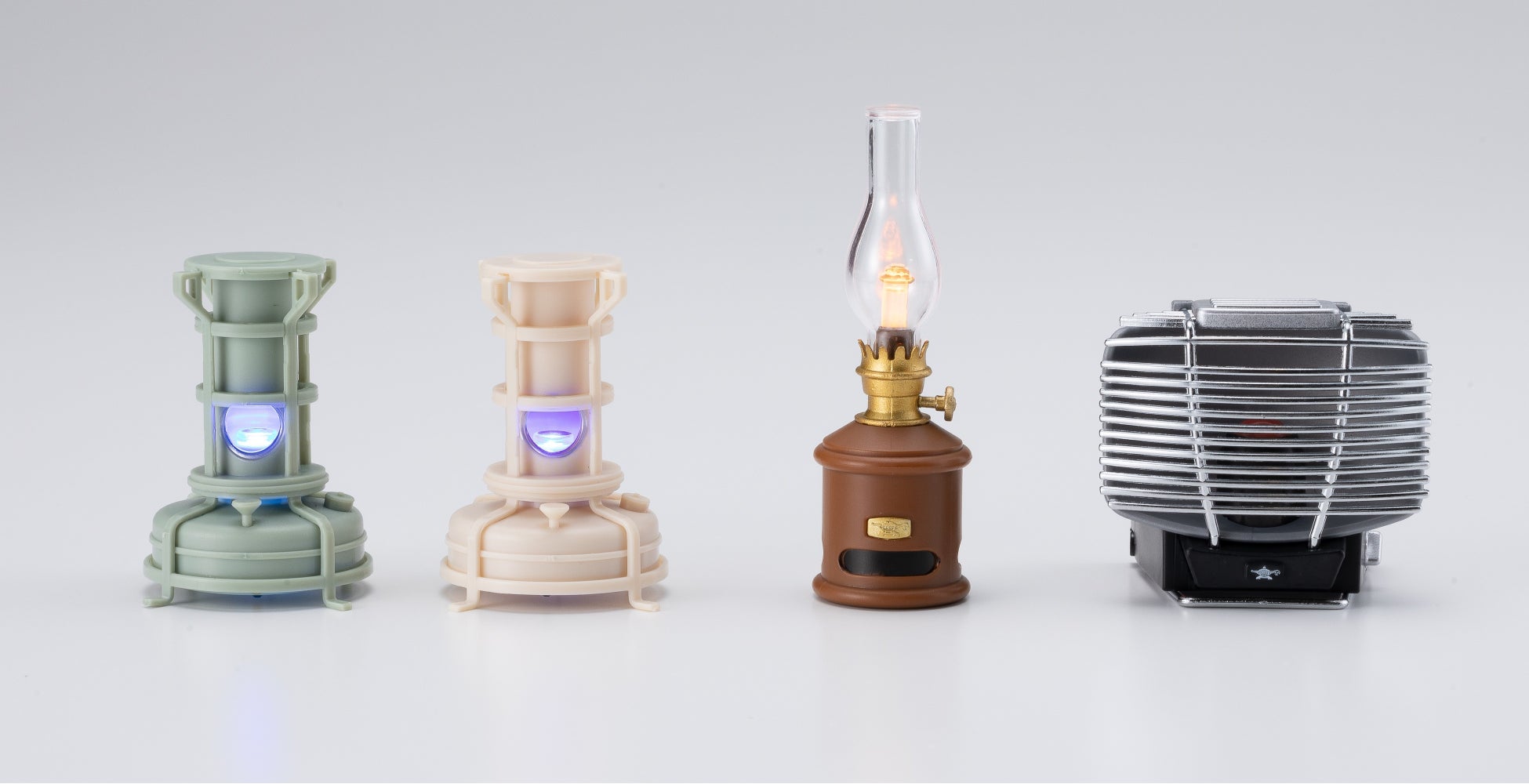 今回で第4弾目となる『Aladdin ミニチュアフィギュア Vol.4』全4種では、アラジンの人気商品で上質な音色を奏でる「ランタンスピーカー」がカプセルトイになって新登場。高級感のあるフォルムと温かみのある灯りをLEDライトで細部まで忠実に再現した仕上がりになっています。また、アラジンブランドと製造元である株式会社千石(Sengoku)の技術を融合させたブランド「Sengoku Aladdin」のポータブルガスシリーズからは「ポータブル ガス ストーブ シルバークイーン」が新たに登場。ストーブ後ろのふたは開閉することができる仕様で、操作つまみも回すことができます。さらに、第1弾で好評を博した「ブルーフレームヒーター(レトロタイプ)」が装いを新たに再登場。癒しの青い炎をLEDライトで忠実に再現したミニチュアフィギュアはグリーン、ホワイトの2色で販売いたします。