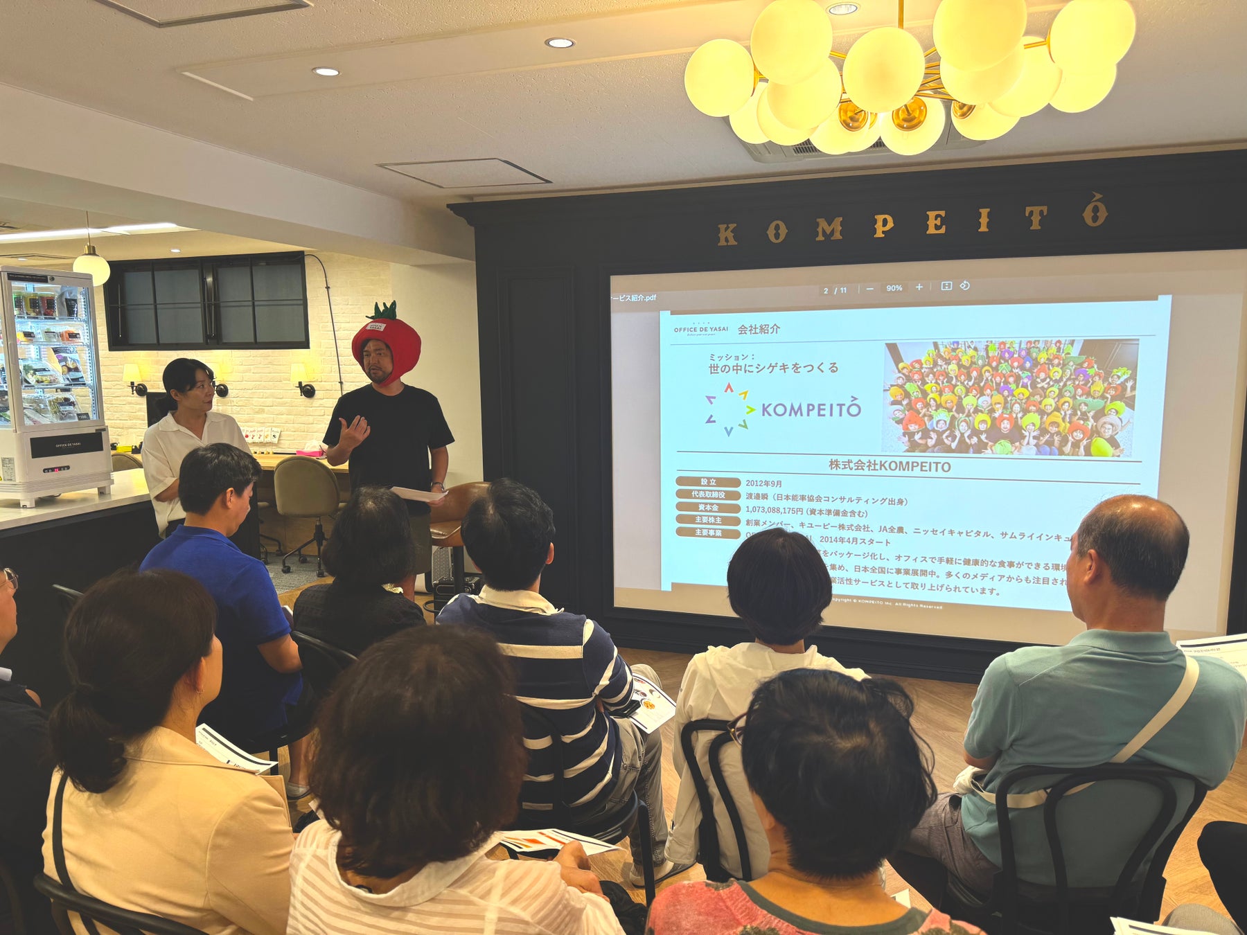 2024年8月30日(金)、“設置型健康社食®“「OFFICE DE YASAI(オフィスで野菜)」を運営する株式会社KOMPEITO(東京都品川区、代表取締役CEO 渡邉瞬)は、韓国ソウル大学フードテック最高責任者課程の学生および担当者約20名を迎え、オフィスにて研修を行いました。