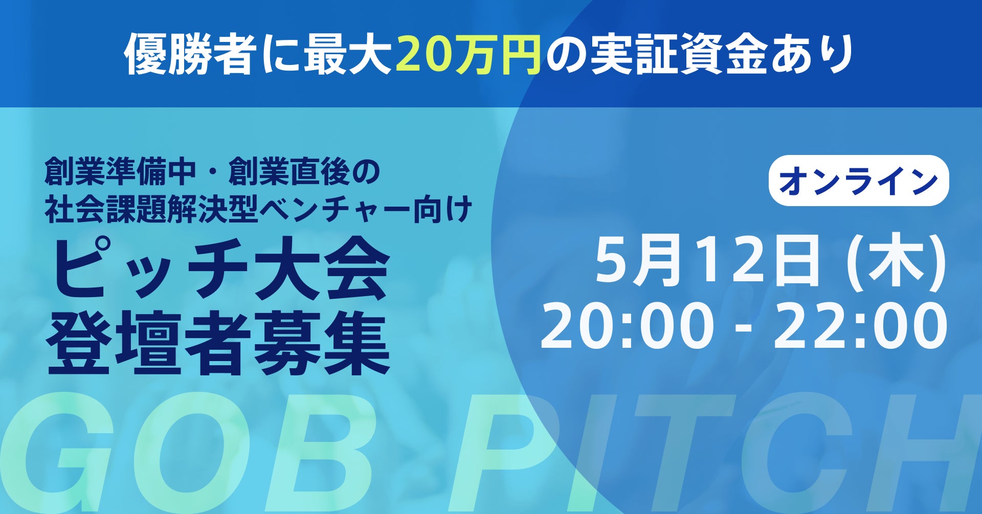 ESG志向の事業創造に投資するGOB Incubation Partners株式会社(東京都渋谷区、代表取締役:山口高弘、以下「GOB」)は、2022年5月12日に起業家5名によるピッチ大会をオンラインで開催します。ピッチ出場を希望する起業家の方の応募受付を開始しました(締め切り:4月27日)。なお同大会は、GOBが運営する社会課題の解決と利益を両立させた事業を目指す起業家向けオンラインコミュニティ「ESG起業らぼ」が主催します。