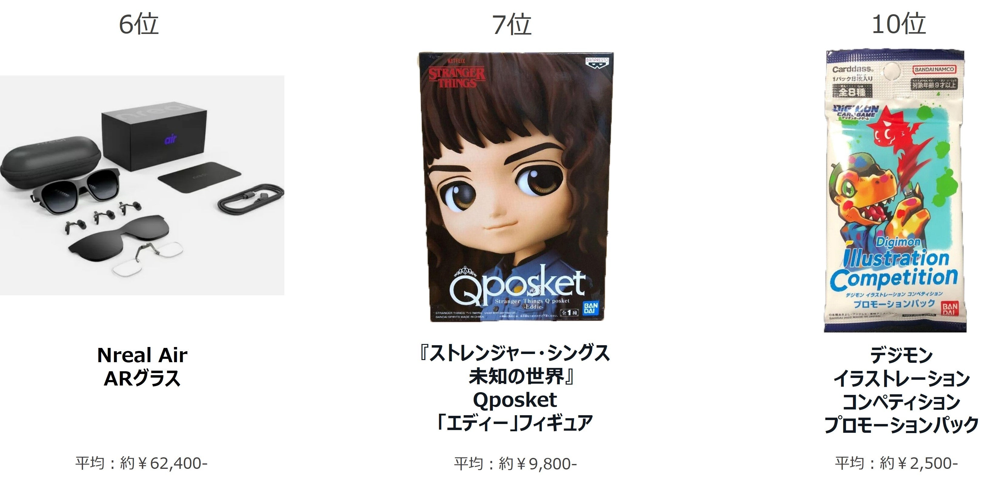 「Nreal Air(エンリアル エアー)」はKDDIとドコモから今年発売されたスマートグラスで、スマートフォンなどの端末に接続することでAR(拡張現実)体験が楽しめるものです。有線ながら普通のサングラスと変わらない大きさ、軽さで話題となりました。Netflixで配信されているアメリカの大人気SFホラードラマ『ストレンジャー・シングス 未知の世界』の登場キャラクターのフィギュアは、日本のクレーンゲームでしか入手できない商品です。また、「デジモンイラストレーションコンペティション プロモーションパック」は人気ゲーム・アニメコンテンツである「デジタルモンスター」の25周年を記念し開催されたデジモンミュージアムの来場者特典となっており、これらの「日本でしか手に入らないアイテム」は世界中のコレクターが集まるeBayでは非常に人気です。