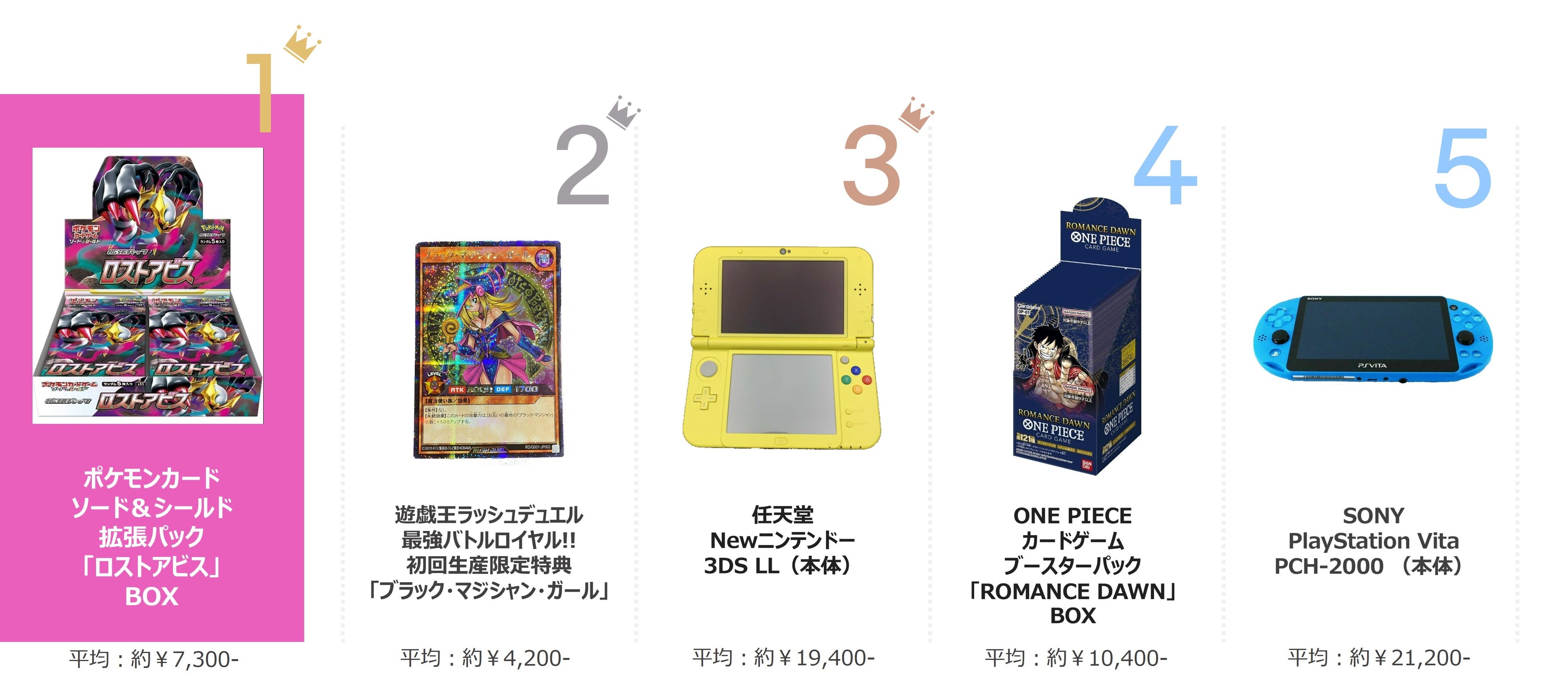 売れ筋商品では7月に発売された「ポケモンカード ソード&シールド拡張パック『ロストアビス』」が1位を獲得しました。ポケモンカードは9期連続の1位となっています。2位は前期と変わらず遊戯王カード「ブラック・マジシャン・ガール」がランクイン。Nintendo Switchのゲーム『遊戯王ラッシュデュエル 最強バトルロイヤル!!』の購入者特典となる限定カードです。4位にランクインしたのは人気アニメ「ONE PIECE」の漫画連載25周年を記念し7月に発売されたトレカ「ROMANCE DAWN」BOX。「ONE PIECE」は日本でも映画が大ヒットしましたがもちろん海外での人気も絶大で、フィギュアやポスター、日本語の漫画の販売も増えています。3位、5位に入ったのは前期もTOP5に入ったポータブルゲーム機「ニンテンドー3DS LL」と「PlayStation Vita」で、どちらも生産終了した商品です。