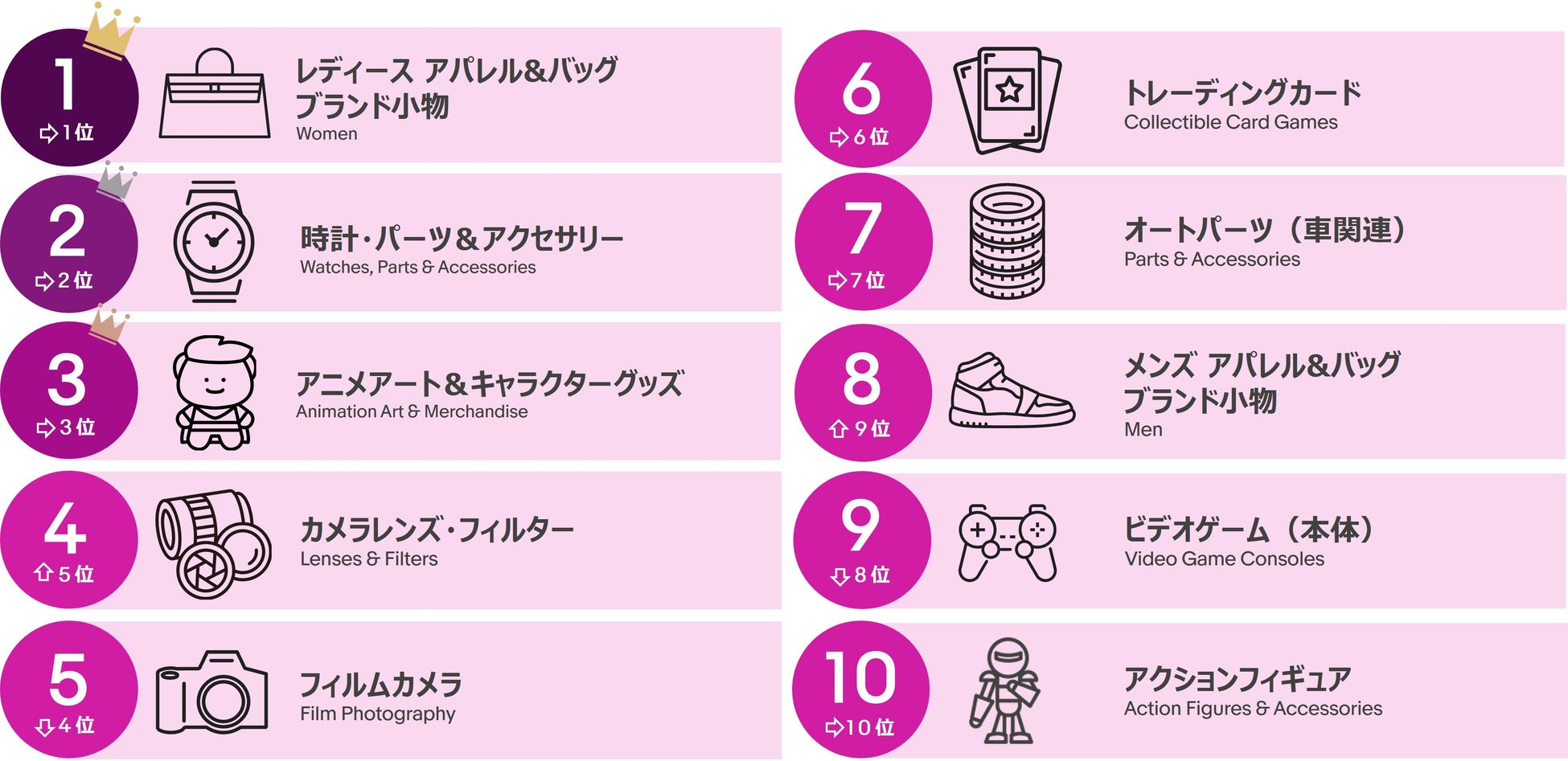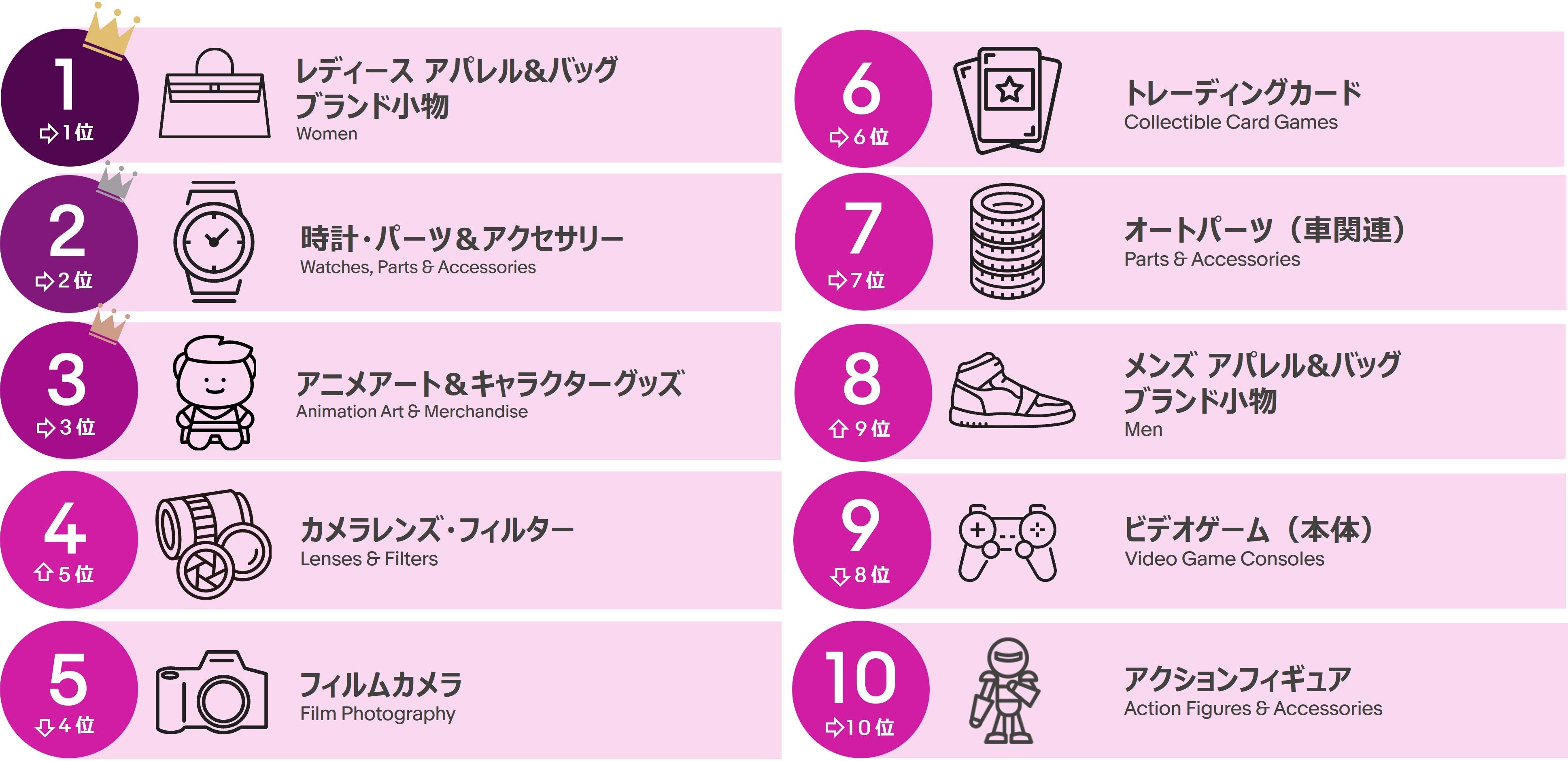 円安の影響を受けた海外の高級品需要は引き続き高く、カテゴリーランキングでは腕時計が2期連続で成長率1位となりました。取引額ランキングでは女性向けブランドバッグが今期も安定の1位に。腕時計、ブランドバッグとも高額商品はeBayの「真贋保証サービス」の対象となることも後押しし、ロレックスやエルメスなどの高級ブランドが好調でした。また世界的ブームとなっているスニーカーの販売が日本からも大きく伸長、メンズファッションを成長率で3位に押し上げました。