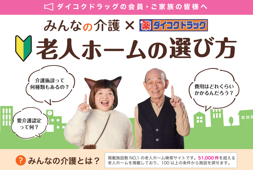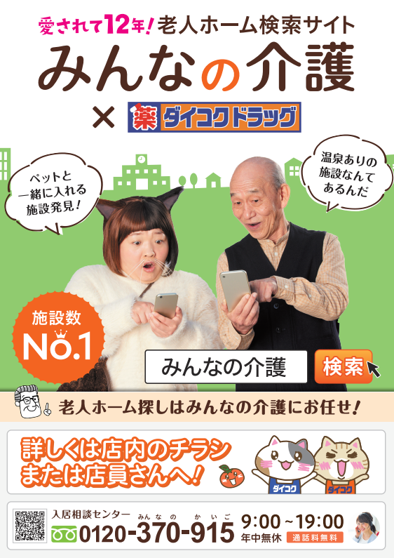 2023年4月より、全国107店舗を展開する大手ドラッグストアチェーン「ダイコクドラッグ」を運営する株式会社ダイコクと介護施設紹介に関するパートナシップを締結致しました。