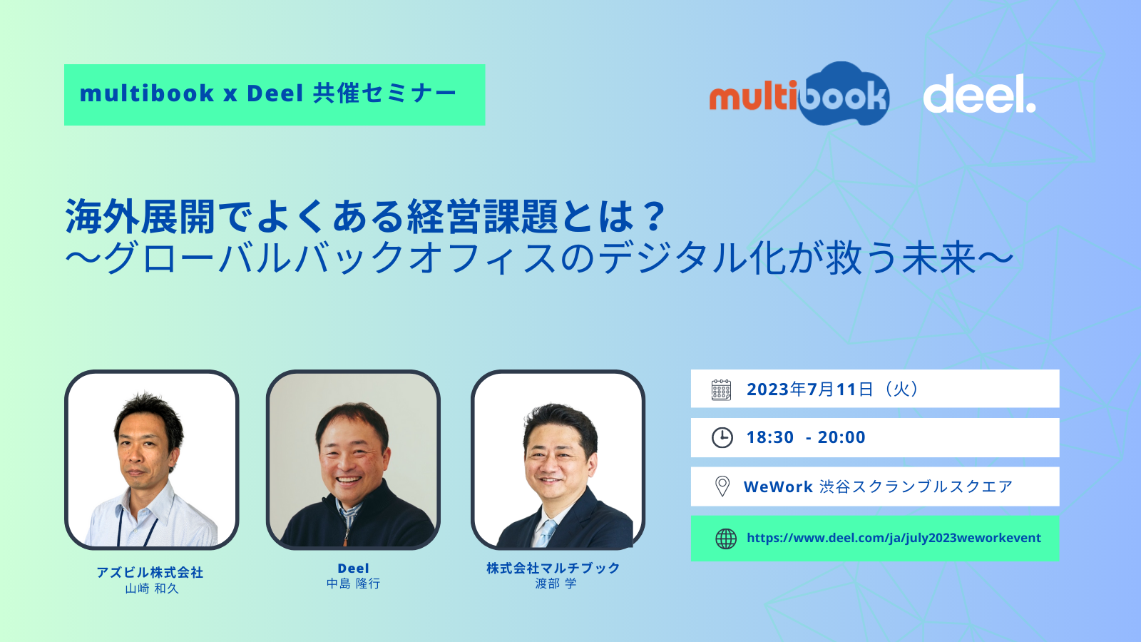 アジェンダ(予定) | 18:00 開場 18:30 開会の挨拶 Deel Inc. カントリーマネージャー 中島 隆行 18:35 第1部 「アズビル海外展開におけるITと人材の課題と理想」 アズビル株式会社 グループ経営管理本部 経理部 部長 山崎 和久 後半ディスカッション登壇: Deel Inc. カントリーマネージャー 中島 隆行 株式会社マルチブック 代表取締役社長 渡部 学 19:15 第2部 「multibook 海外クラウド経理部のご紹介」 株式会社マルチブック 代表取締役社長 渡部 学 「海外展開のリスク・コスト・時間を削減するDeelの人事・給与ソリューション」 Deel Inc. カントリーマネージャー 中島 隆行 19:30 ネットワーキング 20:00 閉会 |