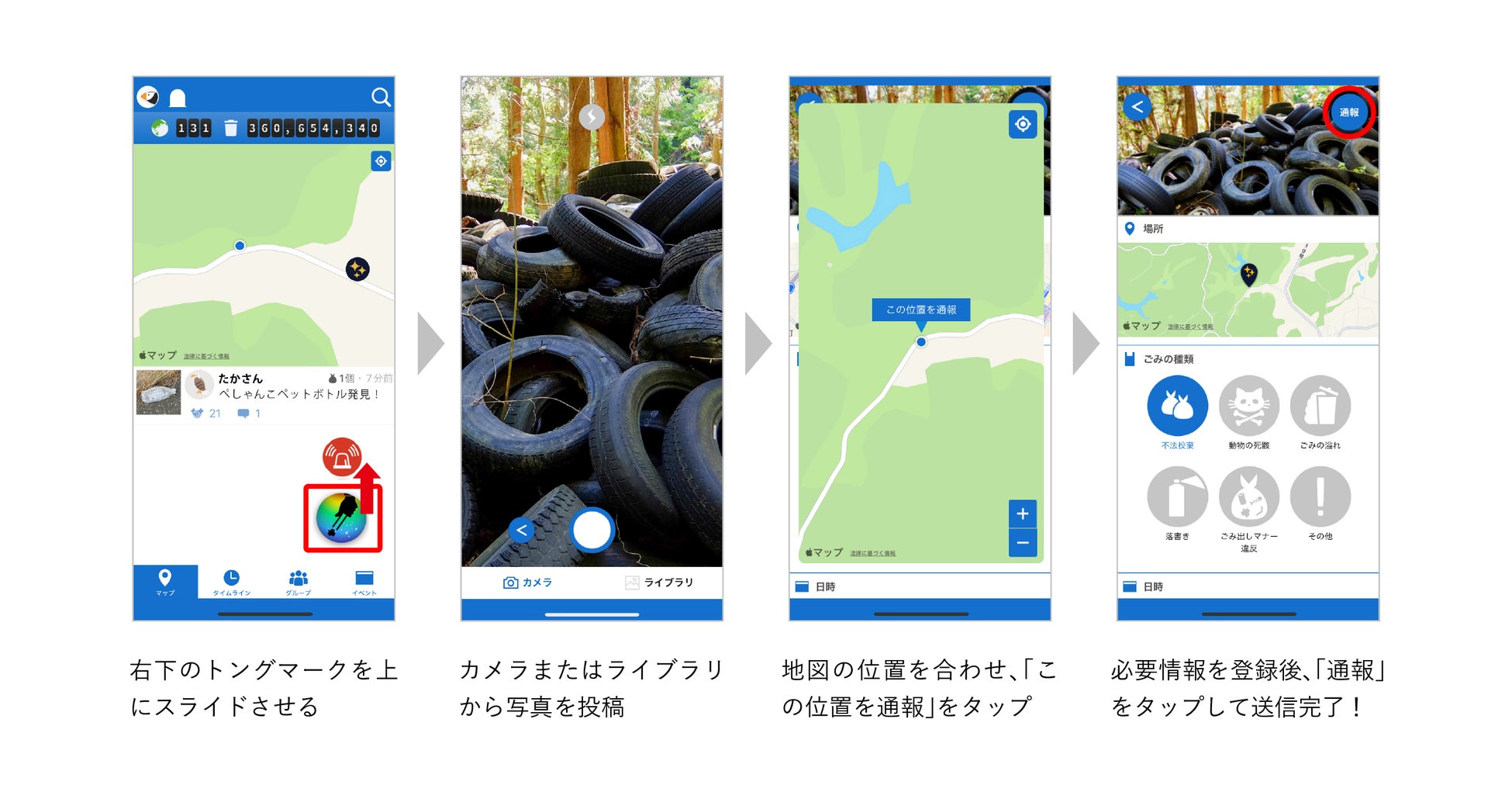 埼玉県内ではアプリ内の通報機能で、自治体に不法投棄などの個人では手に負えないごみの情報を共有することができます。