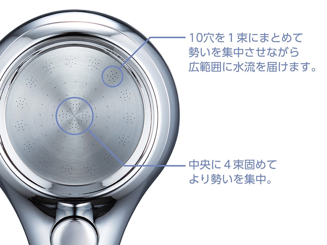 ・穴径0.3㎜の極細水流を高密度集中配置。勢いを集中させながら、広範囲に水流を届ける。