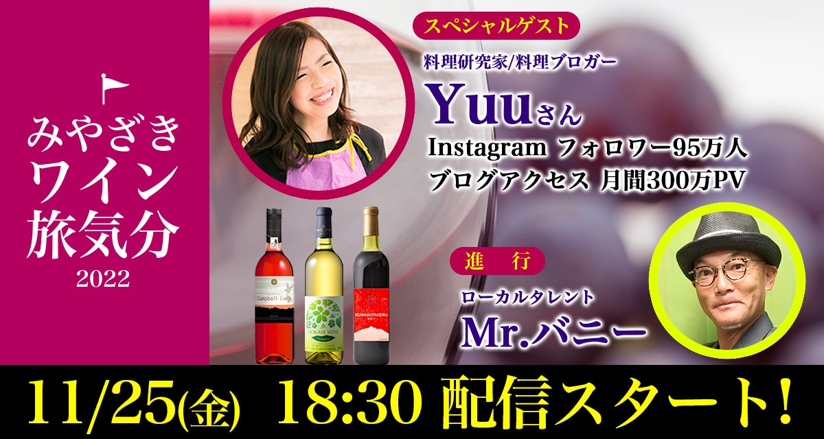11月25日のライブ配信「みやざきワイン旅気分2022」は、10月15日に解禁したばかりのみやざきワインヌーボーを購入した方が、宮崎県内のワイナリーをオンラインツアーで楽しんでいただける企画です。なお、出演者は宮崎県のローカルタレントMr.バニーさんと料理研究家のYuuさんを迎えて、配信します。