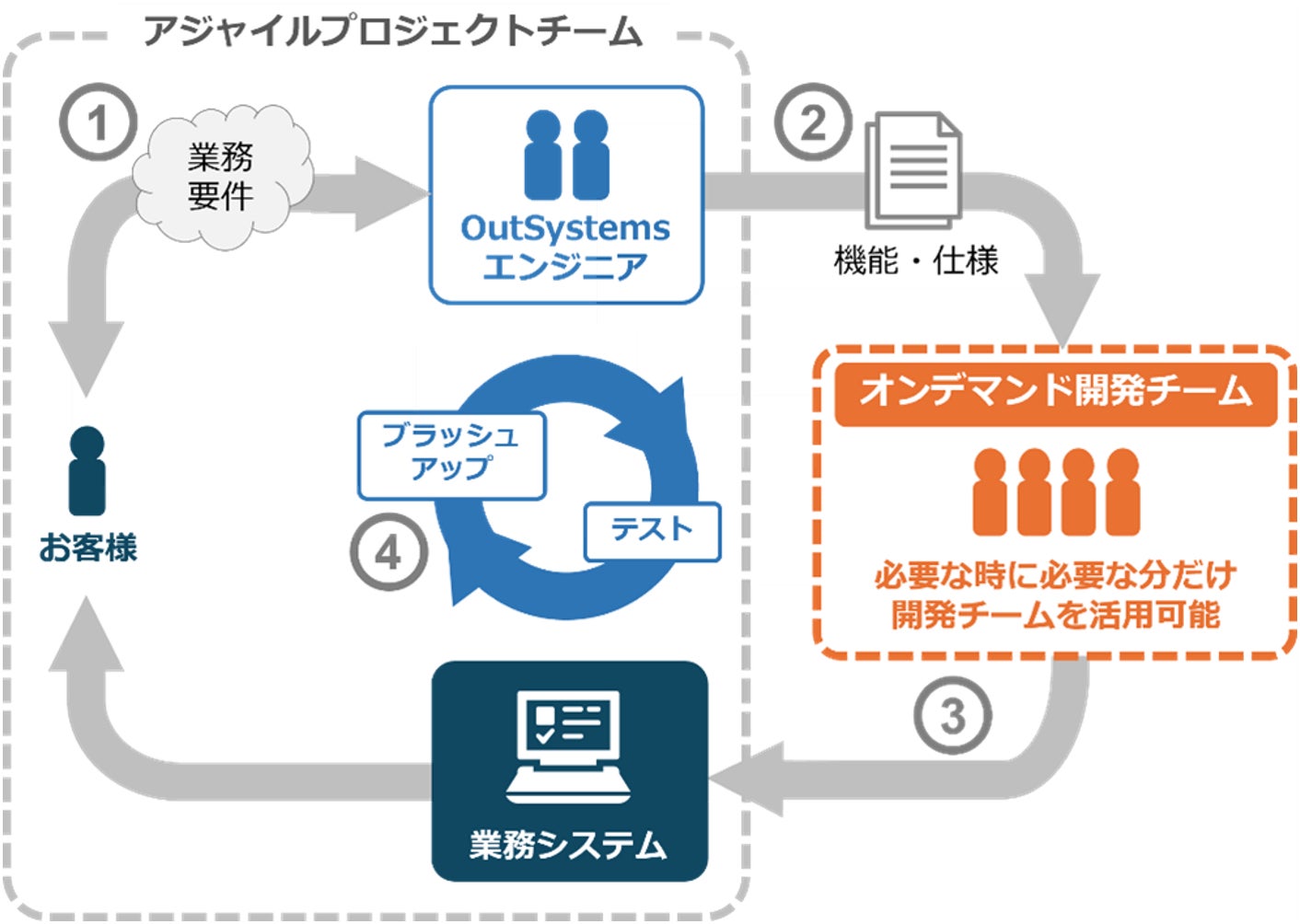 この度提供を開始する「アジャイルオンデマンド for OutSystems」は、これらの課題を解決するための、ローコードを活用したアジャイル開発プロジェクト向けの新しい受託開発サービスです。お客様の開発プロジェクトにおいて、「必要な時に必要な分だけ」、高度な技能や知識を持つローコードのエキスパートを効果的に活用し、業務アプリケーションを構築することが可能になります。プロジェクトの進捗に応じて柔軟に、適切なIT人材の確保が可能になると同時に、過剰な人材リソースの確保が不要になることで、価値駆動型のアジャイル開発を実現します。