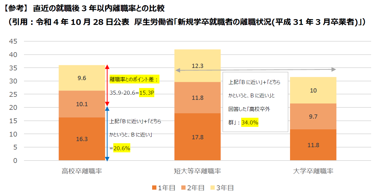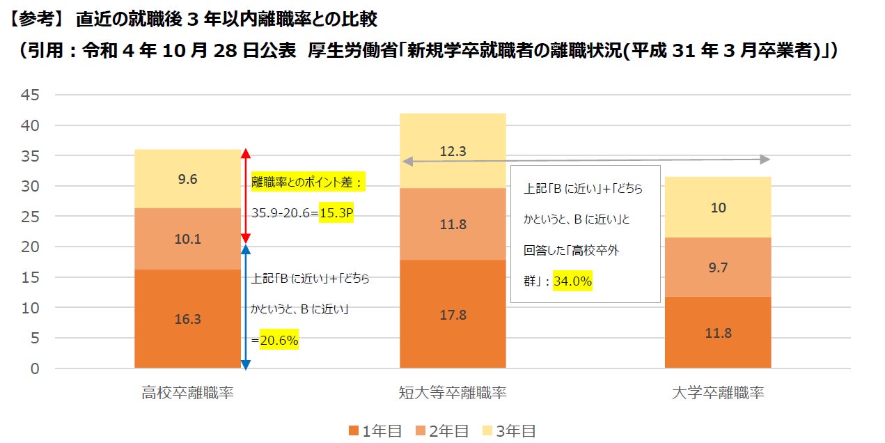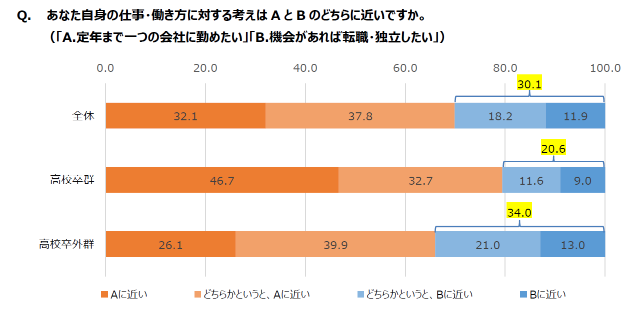 属性別に結果を抽出したところ、「Bに近い」(「Bに近い」+「どちらかというとBに近い」)と答えた割合は高校卒外群34.0%、高校卒群20.6%となりました。厚生労働省調査「新規学卒就職者の離職状況(平成31年3月卒業者)」では、高校卒外群の3年離職率は「大学卒」で31.5%・「短大等卒」で41.9%であった一方、高校卒群は35.9%(高校卒)と当調査と比較して15.3ポイントの差がありました。