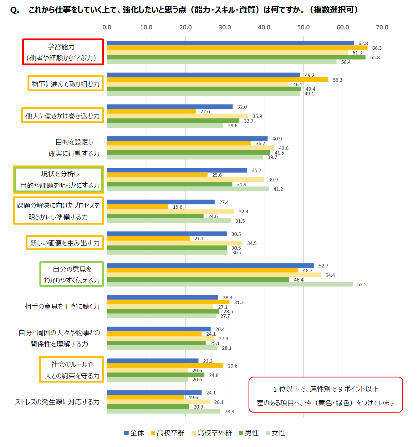 属性別に結果を抽出したところ、「自分の意見をわかりやすく伝える力」で男女の間に16.1ポイント差が、「課題の解決に向けたプロセスを明らかにし準備する力」で高校卒群と高校卒外群との間に16.8ポイント差がありました。設問によって程度の差はありますが、最終学歴・男女差によって意識している課題感が異なる傾向にあると考えられます。