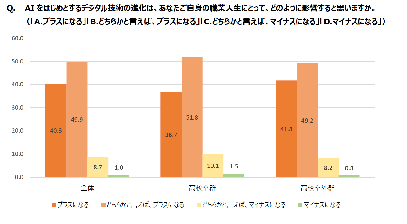 AIをはじめとするデジタル技術の進化と自身の職業人生の関係性について尋ねたところ、「プラスになる」(「プラスになる」+「どちらかと言えば、プラスになる」)との回答が合計90.2%となりました。属性別に見てもこの傾向は変わらず、多くの新社会人がデジタル技術の進化を取り入れることに抵抗がないことと考えられます。