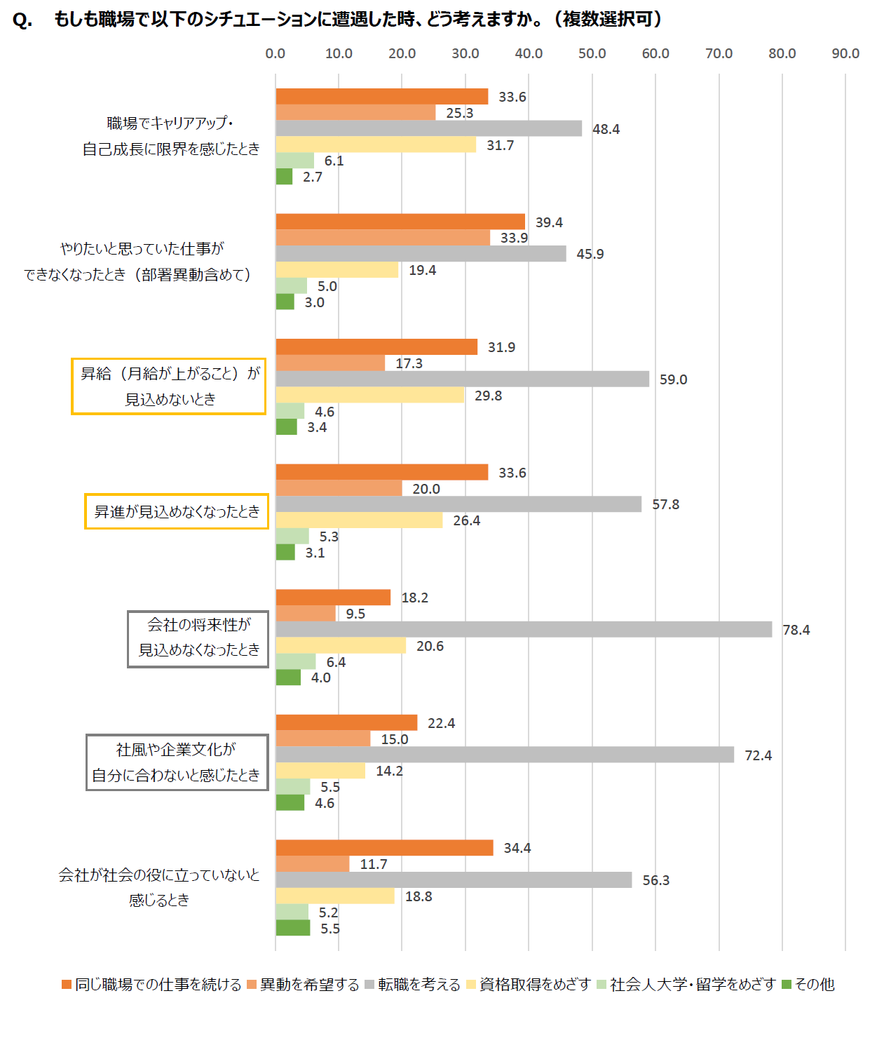 また、第2位は「社風や企業文化が自分に合わないと感じたとき」で72.4%、第3位は「昇給(月給が上がること)が見込めないとき」で59.0%となりました。ただし、第3位のシチュエーションは、第4位の「昇進が見込めなくなったとき」(57.8%)と同様に、「同じ職場での仕事を続ける」を選ぶ回答も約30%ありました。