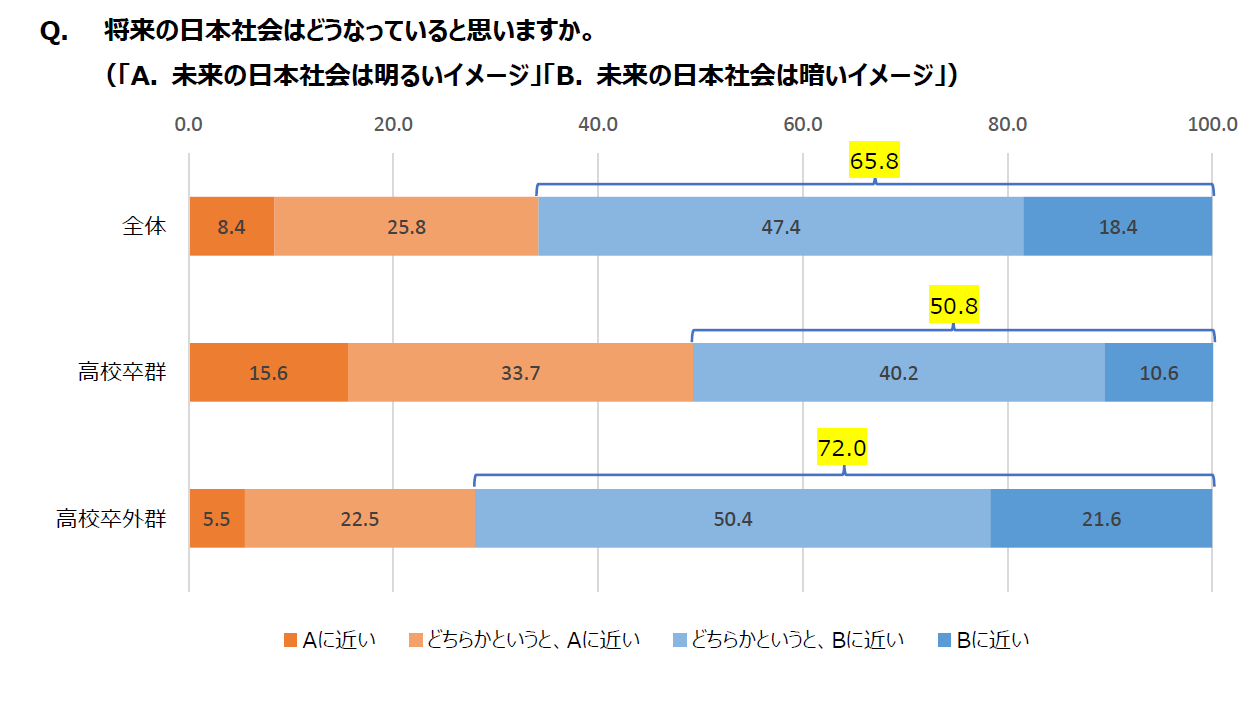 属性別に結果を抽出したところ、高校卒群では合計50.8%、高校卒外群では合計72.0%と、高校卒外群がより悲観的なイメージを持っていることが分かりました。