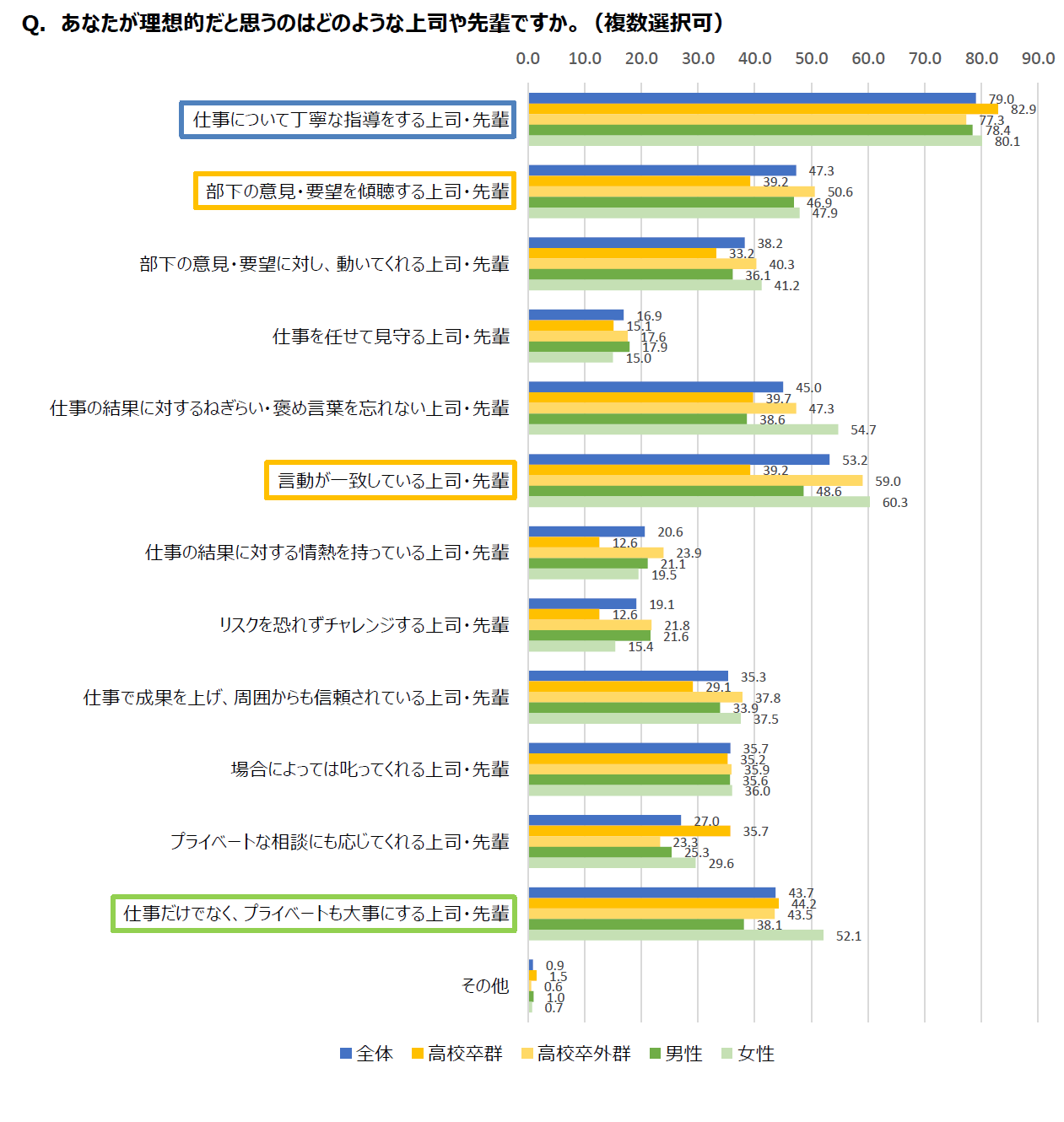 理想的だと思う上司・先輩について尋ねたところ、第1位は「仕事について丁寧な指導をする上司・先輩」で79.0%でした。属性別に結果を抽出したところ、全体で第2位の「言動が一致している上司・先輩」は高校卒群39.2%、高校卒外群59.0%、全体で第3位の「部下の意見・要望を傾聴する上司・先輩」は高校卒群39.2%、高校卒外群50.6%でした。