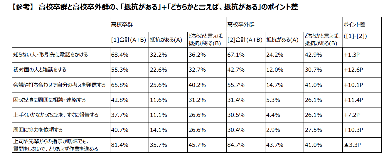 その他の項目について属性別に抽出すると、すべての高校卒群の「抵抗がある」+「どちらかと言えば、抵抗がある」のポイントが、高校卒外群より上回りました。学生生活やアルバイト等の経験年数が増えることによって、抵抗感が抑えられている傾向にあると考えられます。