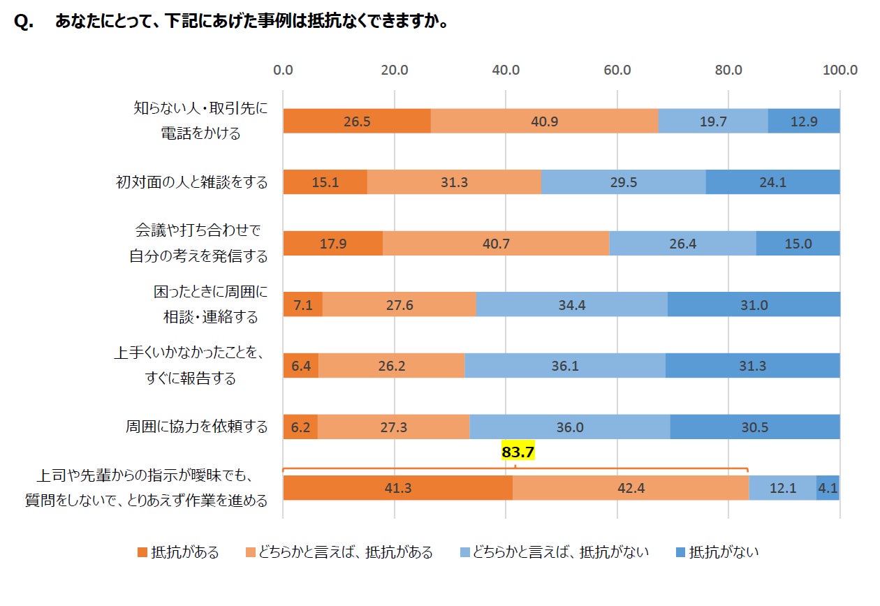 3.仕事上で抵抗を感じる事例の第1位は「上司や先輩からの指示が曖昧でも、質問をしないで、とりあえず作業を進める」で83.7%