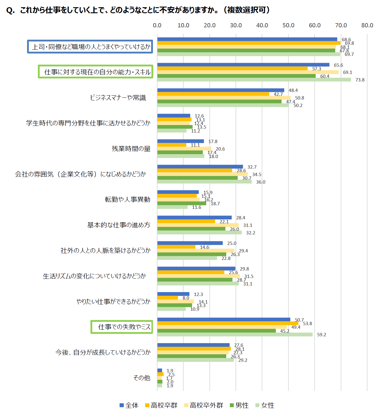 属性別に結果を抽出したところ、第1位の「上司・同僚など職場の人とうまくやっていけるか」は男性67.8%、女性69.7%と同水準である一方、第2位の「仕事に対する現在の自分の能力・スキル」では男性60.4%に対して女性73.8%、第3位の「仕事での失敗やミス」では男性45.2%に対して女性59.2%となりました。女性の方が仕事をしていく上での不安を多く抱えがちな傾向にあると思われます。