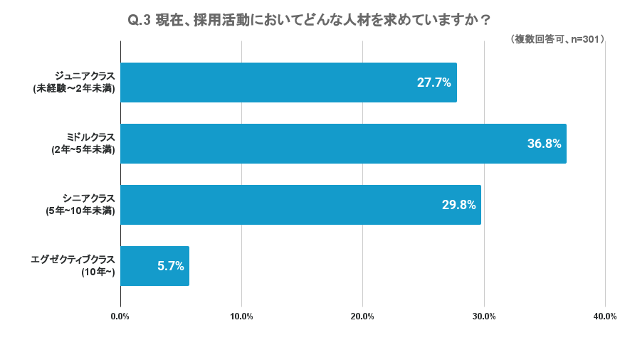企業側が採用したい人材は、「ミドルクラス」が36.8%と最も高く、続いて29.8%の「シニアクラス」が続く。即戦力人材の採用ニーズが高いことがわかる。