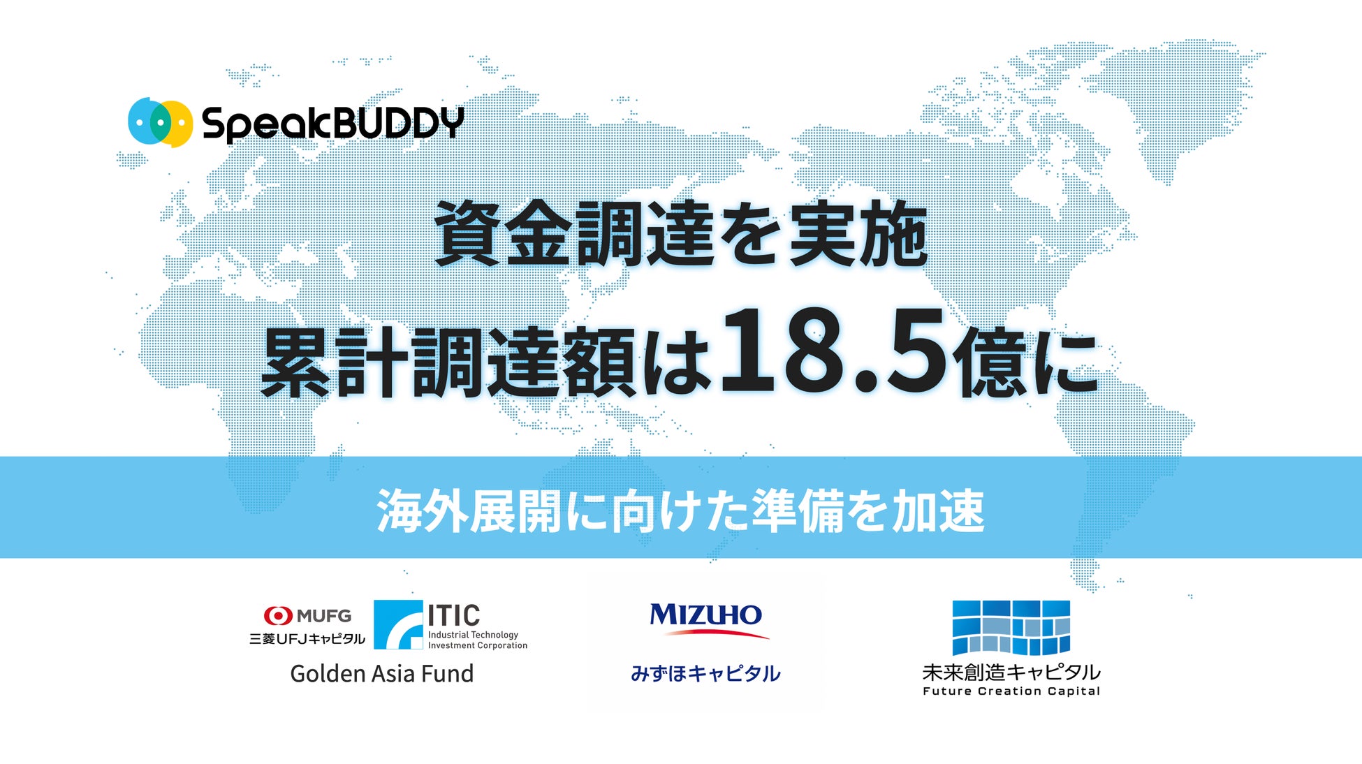 株式会社スピークバディ(本社:東京都中央区、代表取締役社長:立石剛史、以下「当社」)は、この度、Golden Asia Fund(日台ファンド)、みずほキャピタル、未来創造キャピタル(みずほリースCVC 運営会社)より出資を受け、累計で18.5億円の資金調達を実施したことをお知らせいたします。今回の調達により、当社ビジョンに掲げている「アジアのグローバル化を牽引するAI言語習得スタートアップ」実現に向けた動きを加速させていきます。