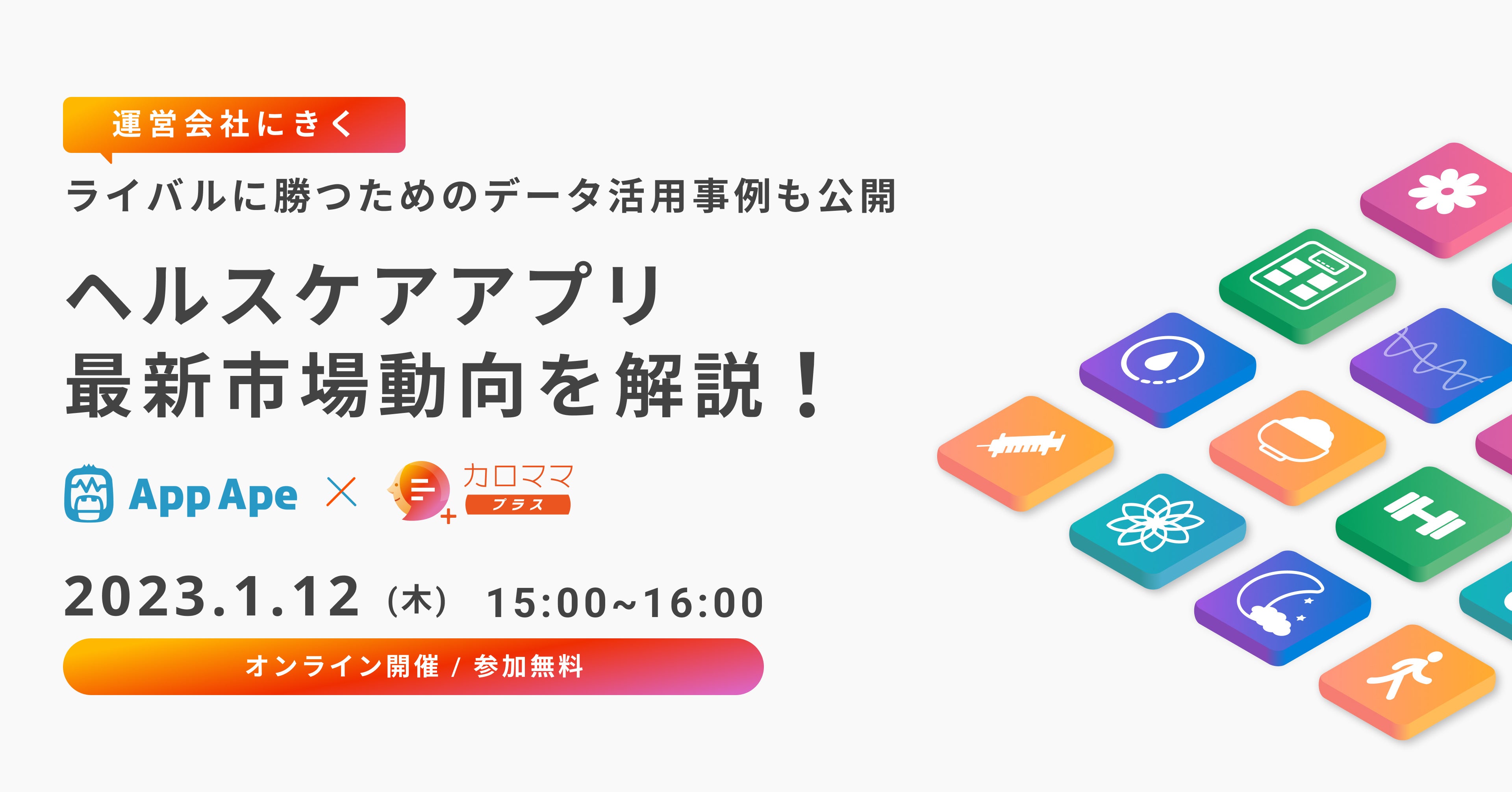 スマートフォンアプリ分析サービス「App Ape(アップ・エイプ)」を手がけるフラー株式会社(本社:新潟県新潟市、代表取締役:渋谷 修太、山﨑 将司、以下「フラー」)と株式会社リンクアンドコミュニケーション(本社:東京都千代田区、代表取締役社長:渡辺 敏成)は、2023年1月12日(木)にヘルスケアアプリの最新市場動向とデータ活用術をテーマとしたオンラインセミナーを開催します。