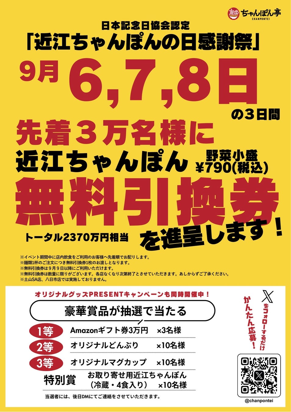 この特別な3日間、全国の「近江ちゃんぽん亭」では、先着3万名様に総額2370万円相当の「近江ちゃんぽん野菜小盛 無料引換券」を進呈。さらに、公式Xアカウントをフォローしていただくと、豪華グッズが当たるチャンスも!