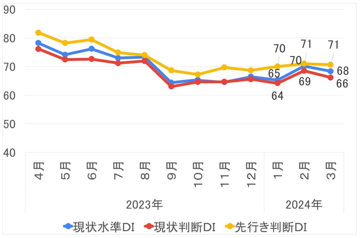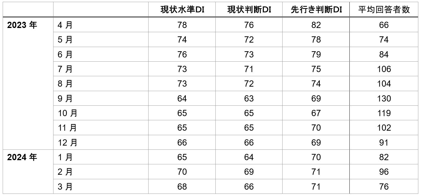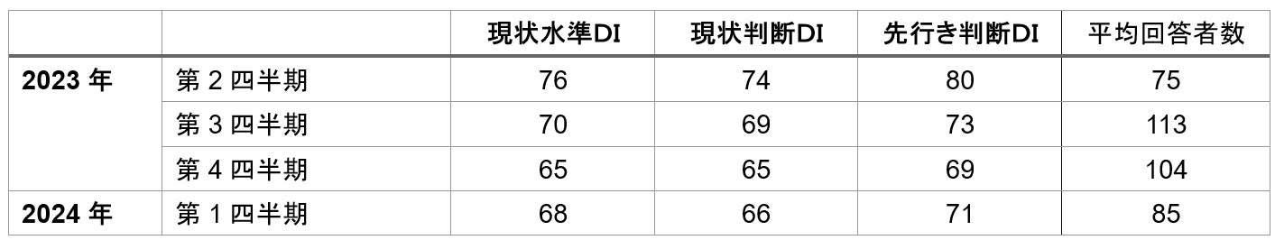 ● 現状水準DIは、前四半期差で+3ポイントの68と横ばいであった。 ● 現状判断DIは、前四半期差で+1ポイントの66と横ばいであった。 ● 先行き判断DIは、前四半期差で+2ポイントの71と横ばいであった。 |