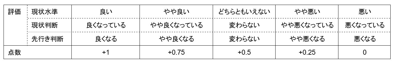 ▽調査客体から収集した判断内容を下表のとおり点数化し、その平均値を最低0点から最大100点となる指数(Diffusion Index、DI)として示しています。そのため、この指数では50より大きいほど「購買意欲が強い」、小さいほど「購買意欲が弱い」と判断されていることになります。