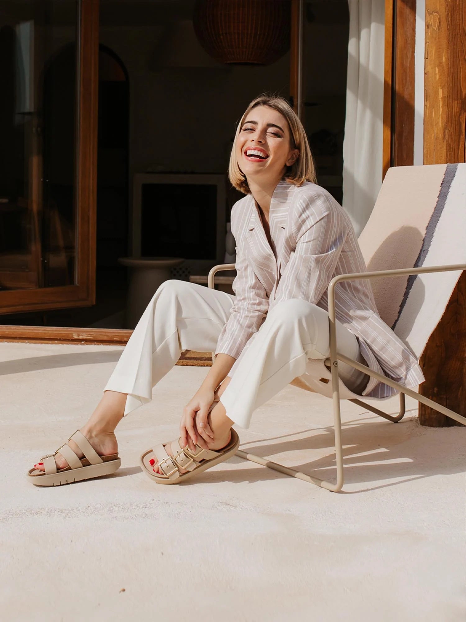 3本のストラップと大きめのバックルがポイントのプラットフォームサンダル。ストラップにはサンドカラーのストラップはスムース、ブラックのストラップには型押しを施した合成皮革を採用しています。安定感のある高さ約3.5cmのソールが、歩きやすさとスタイルアップを叶えます。