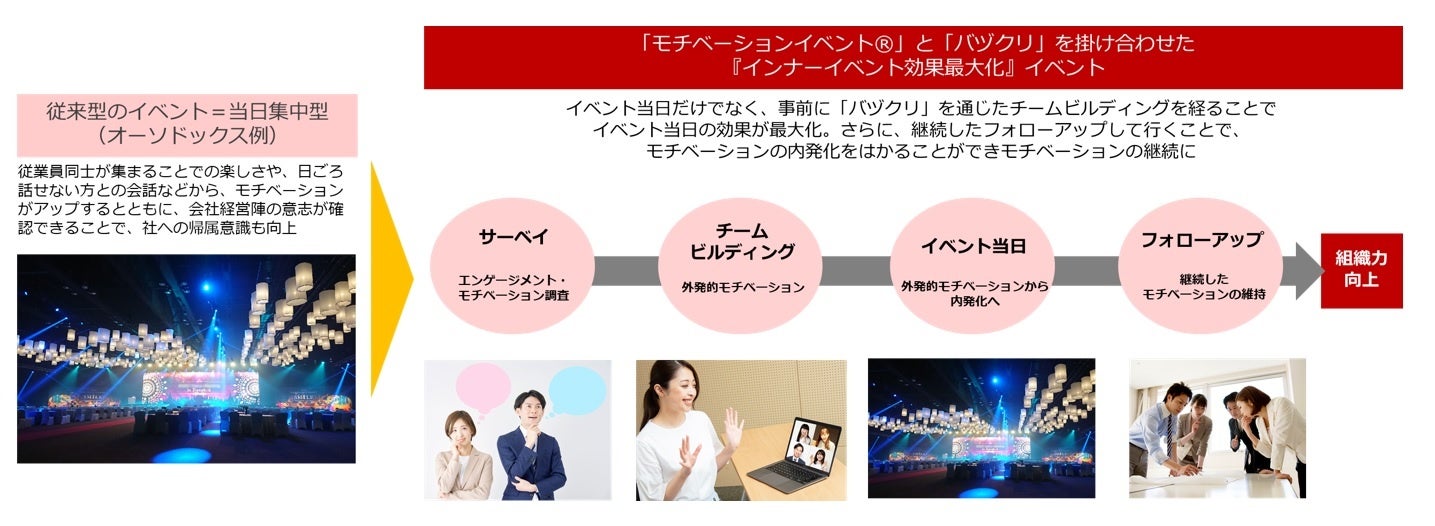 そこでJCDの「モチベーションイベント®」※1と、「バヅクリ」※2のサービスを融合させ、参加者の関係構築やモチベーション向上を促すイベント実施することで、インナーイベントにおける効果の最大化を目指しています。