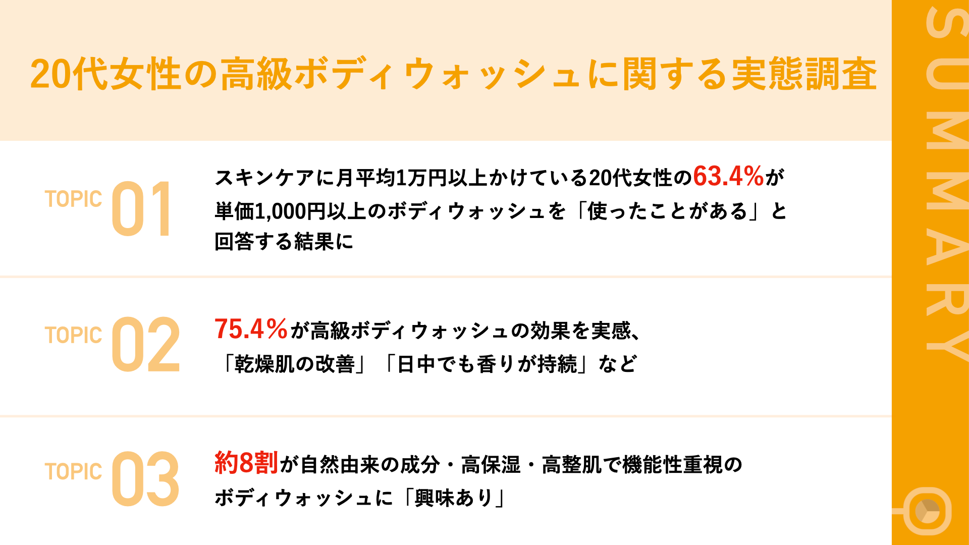 今回の調査から、多くの20代女性が、「香り」「保湿」を求めて、高価格帯ボディウォッシュを購入し、その効果を実感していることがわかりました。この機会に、高価格でも、自分の好きな「香り」や高い「保湿」効果を得ることのできるボディウォッシュの購入を検討してみてはいかがでしょうか。