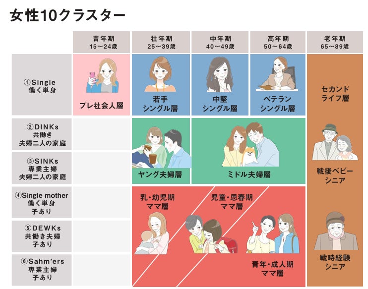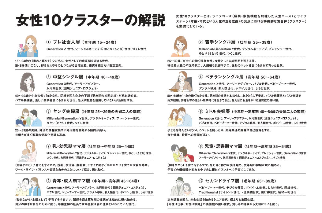 当研究所では、女性を以下のように10のクラスターに分類し、それに基づいた生活背景や消費行動を深く分析しています。