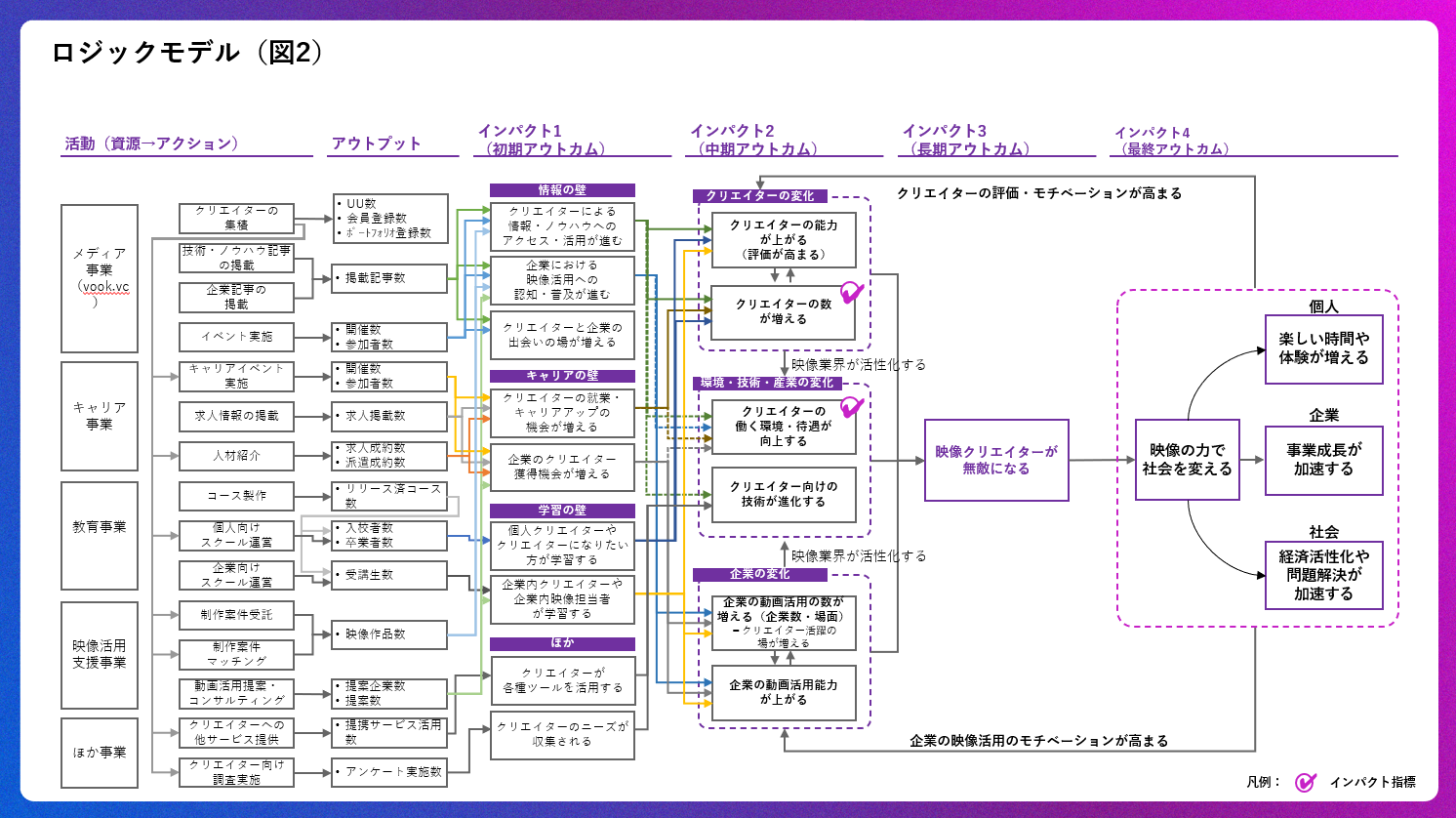 日本テレビHDおよびVook経営陣とともに複数回の検討を重ね、同社が目指す社会的インパクトと戦略の詳細をロジックモデル(図2)により可視化しました。