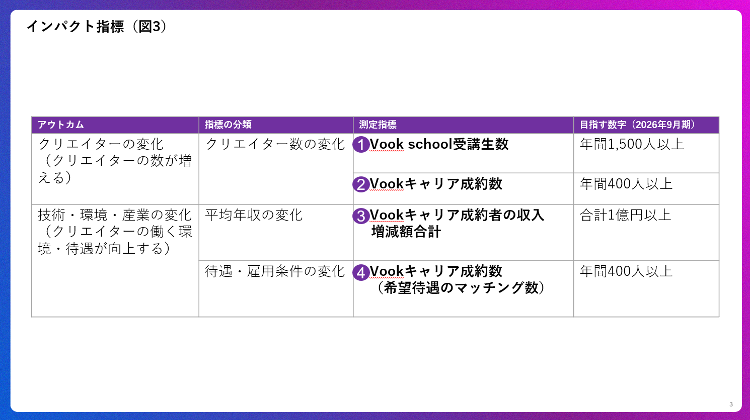 ロジックモデルに基づき、日本テレビHDが目指すインパクトと重ね合わせ、クリエイターの数や働く環境・待遇の改善・向上を測定指標(図3)として設定しました。今後は、日本テレビHDおよびVookの間でこれらの指標が定期的に測定され、両社で社会的インパクトの創出・拡大に向けた取り組みが続けられます。