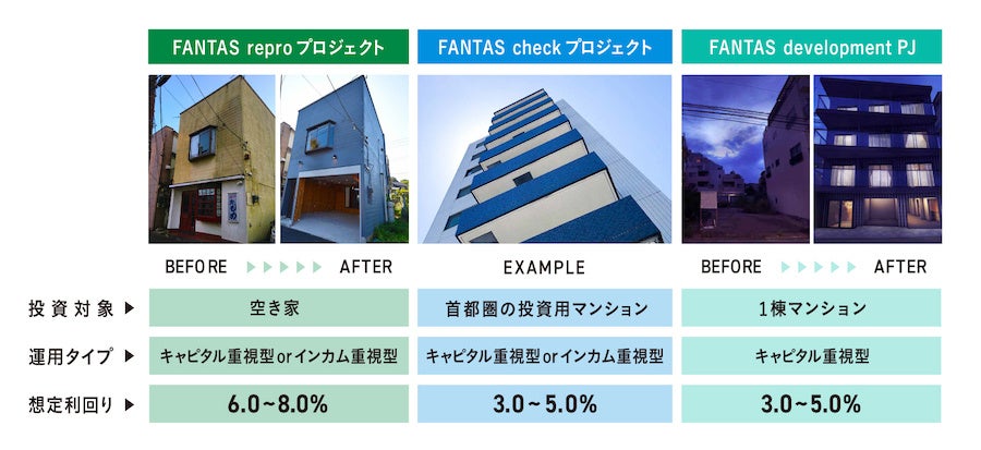 空き家再生の FANTAS repro(6~8%)、中古区分マンションのFANTAS check (3~5%) 、 一棟マンション開発のFANTAS development(3~ 5%)の3種類のプロジェクトでリスクに見合った投資対象を選択できます。
